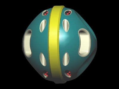 Revised concept for a Vascular Cartographic Scanning Nanodevice (VCSN) (see Boehm 1 – Boehm 5): Images Boehm 6 – Boehm 9 represent a more recent design for the VCSN. All of the scanning components are nested in the band circumscribing the device, and more robust fluidic thrusters have been added.
