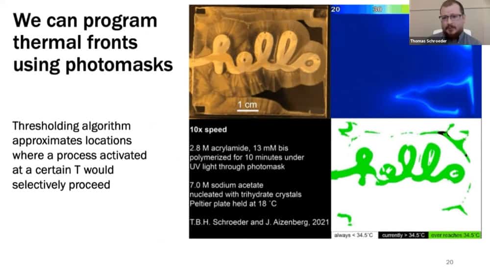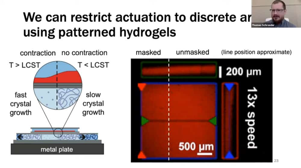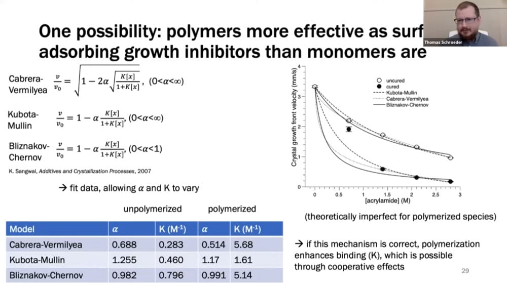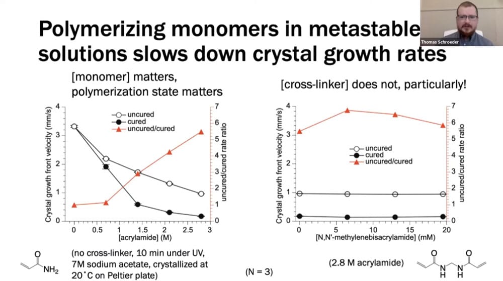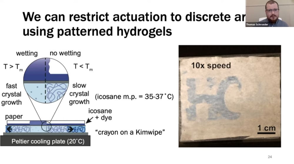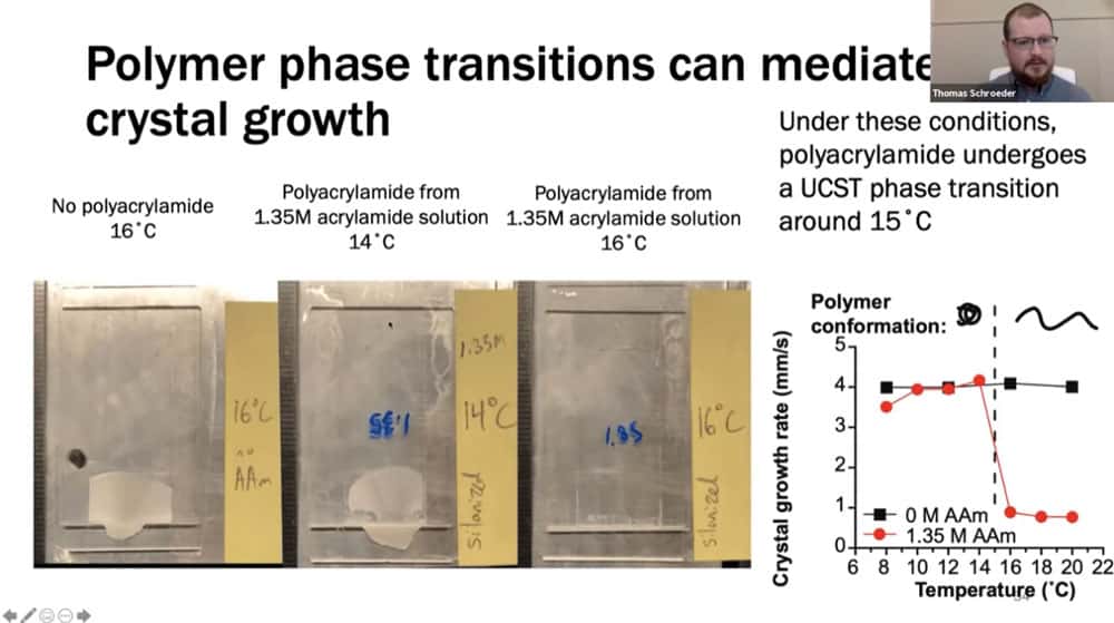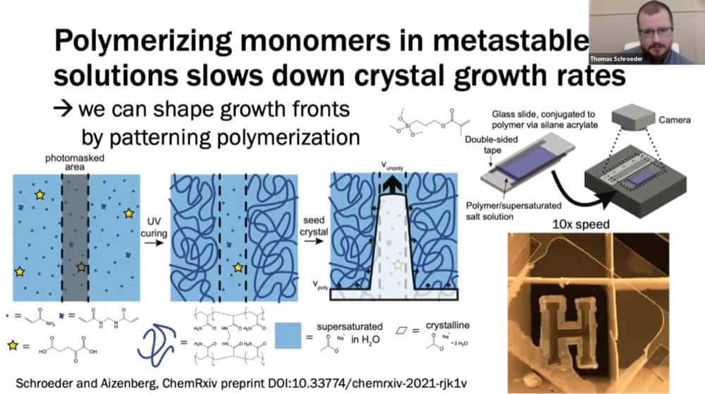 Tom’s work involves understanding the fundamental properties of crystal formation in the context of speed, composition, and temperature. He is investigating ways of controlling crystal growth such as photomasks and patterned hydrogels.