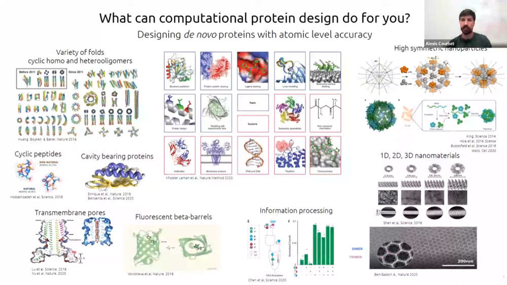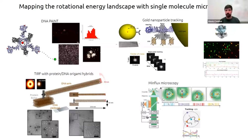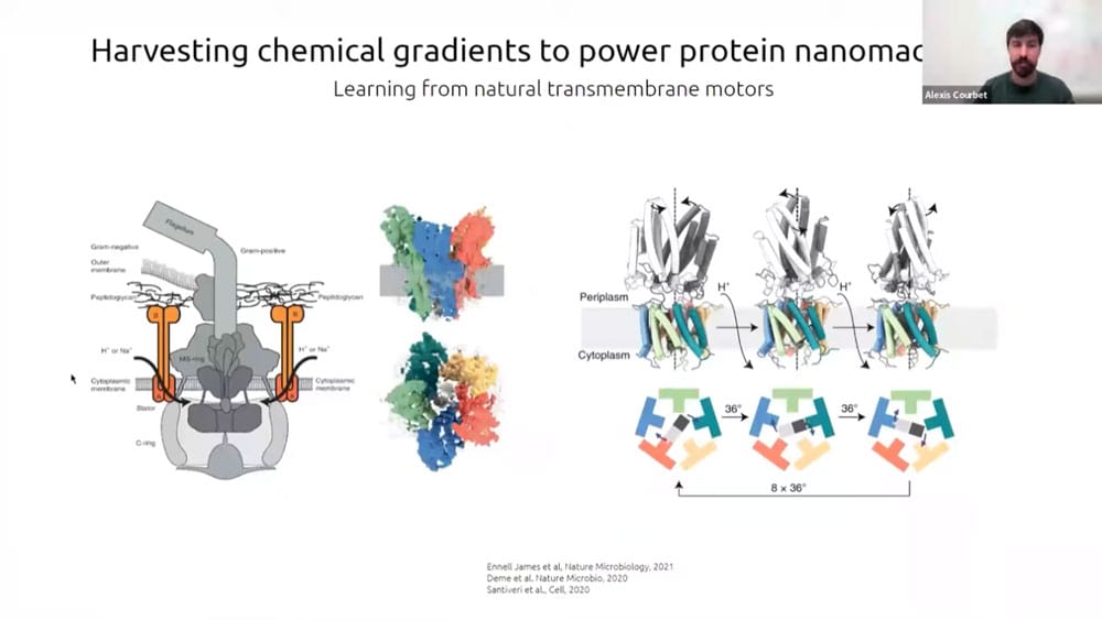 Alexis’s research proposes to investigate computational design rules to rationally install biochemical energy driven dynamic and mechanical behavior within de novo protein nanostructures, by tailoring the energy landscape to capture favorable thermal fluctuations allowing to perform work (i.e. rationally designing a Brownian ratchet mechanism using energy from the catalysis of a biologically orthogonal small molecule to break symmetry). As a proof of concept, he is focusing on the de novo design of protein rotary motors, in which symmetric energy minima along an interface between multiple components couples rotation to a catalytic event, thereby converting the biochemical energy of a fuel molecule into work.