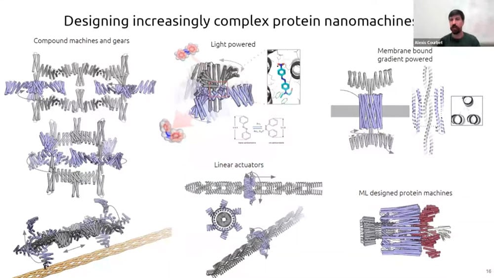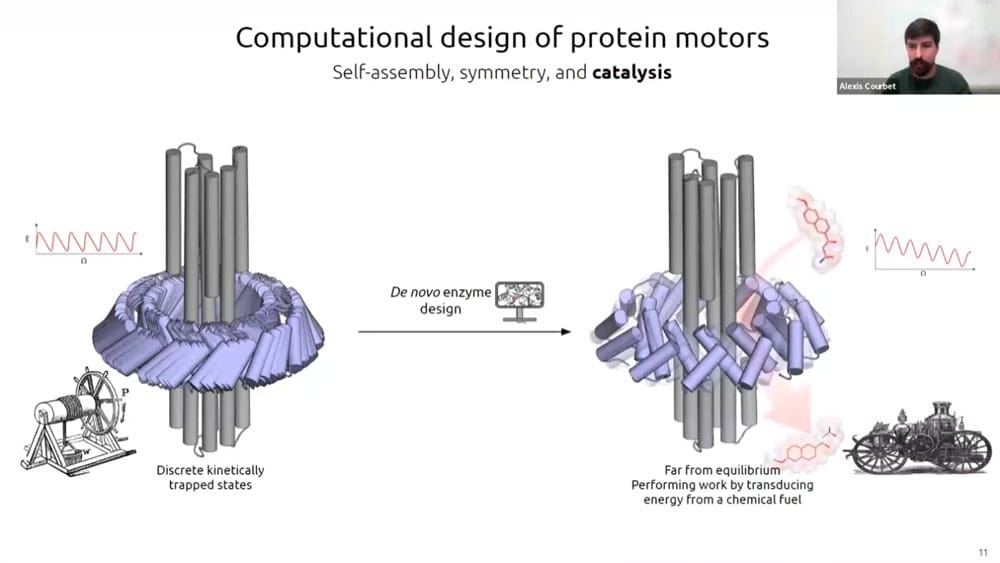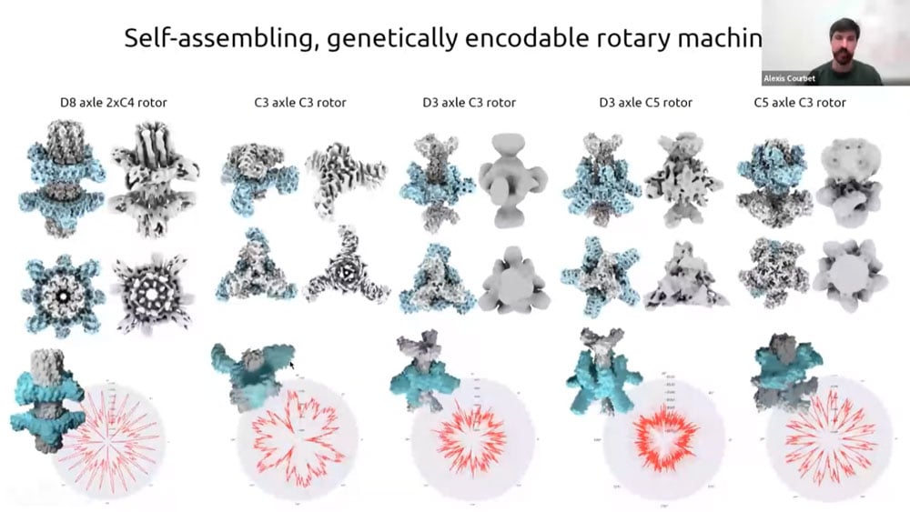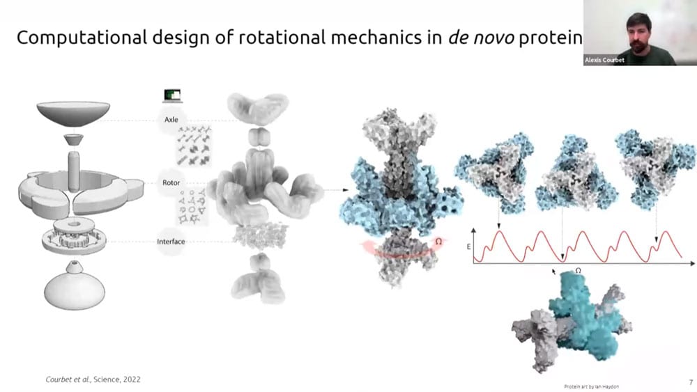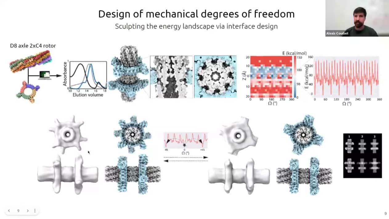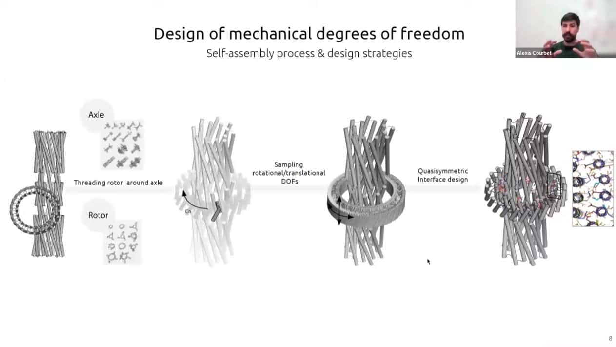 There has recently been a surge of progress with computational protein folding. Alexis is working on designing atomically precise machines using proteins as structural and mechanical elements. One of the first designs is an axel and rotor assembly. He started by designing the components separately, then computing the interface between components. He then simulated the motion and degrees of freedom to calculate whether the machine would perform the intended function.
