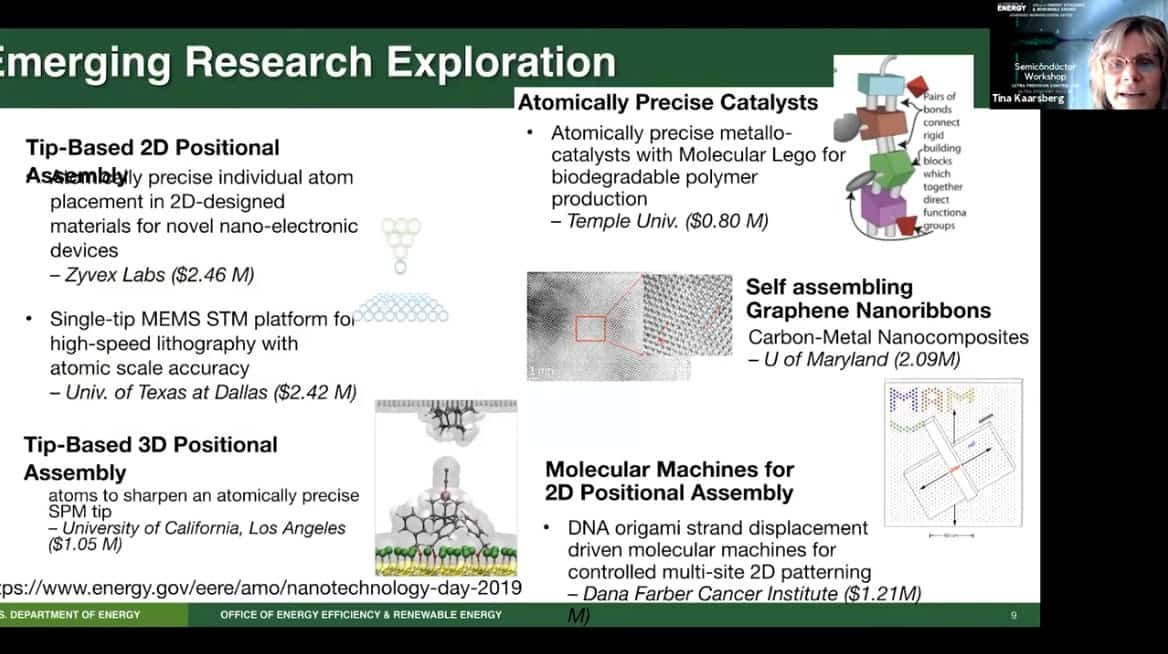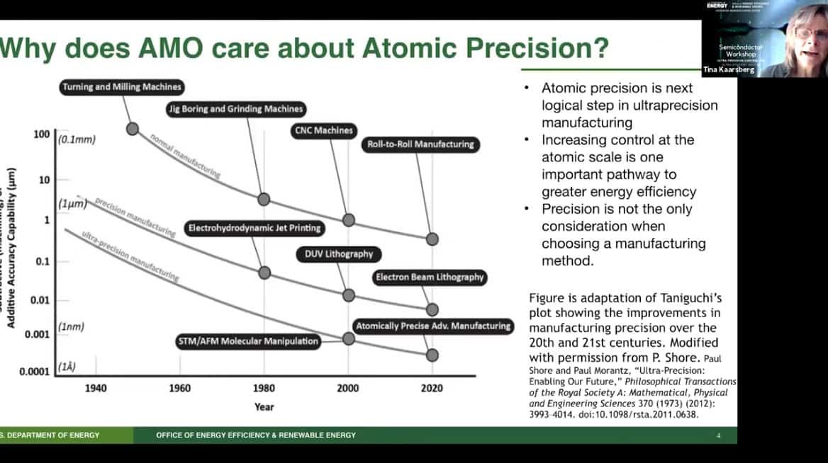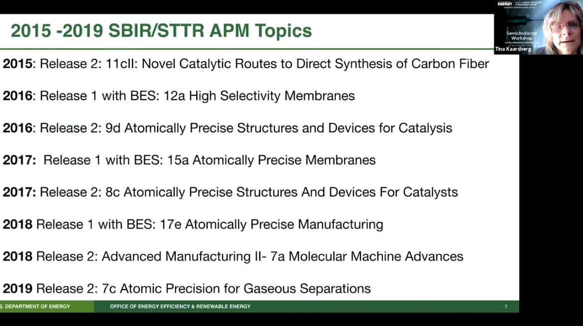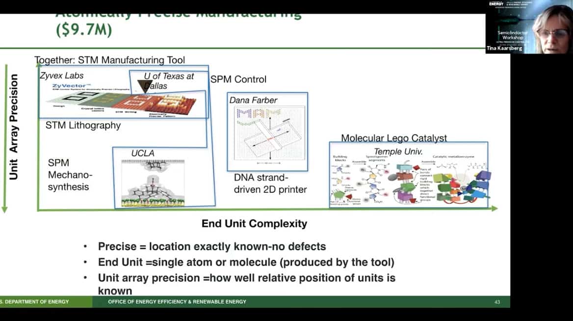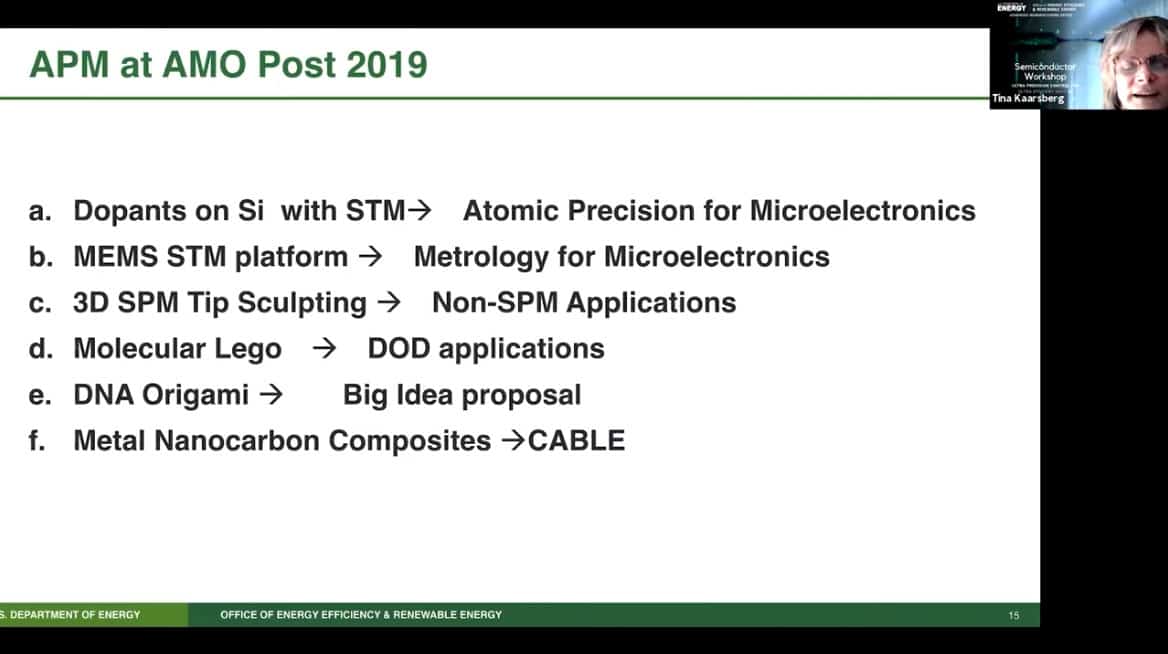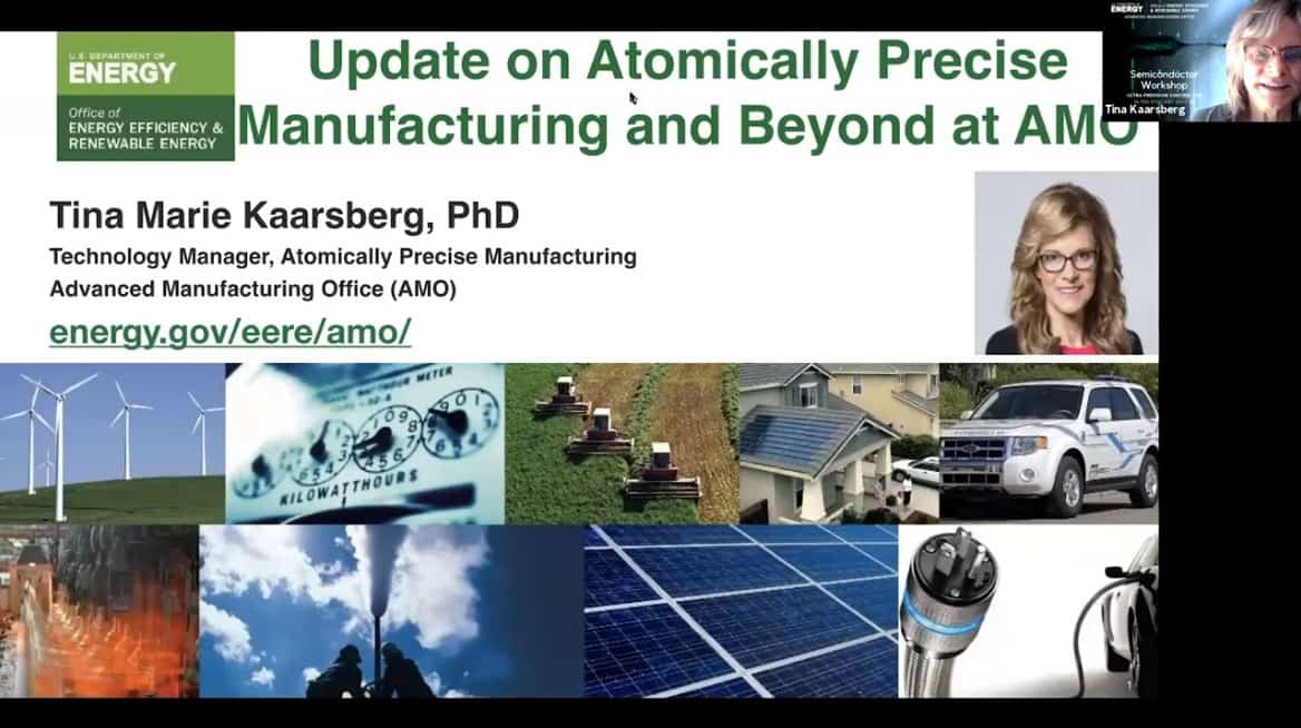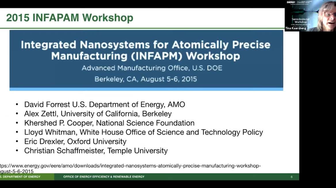 - Presenting today is Tina Kaarsberg of the US Department of Energy, Office of Energy Efficiency and Renewable Energy. She is part of the Advanced Manufacturing Office (AMO) and speaks about Atomically Precise Manufacturing.