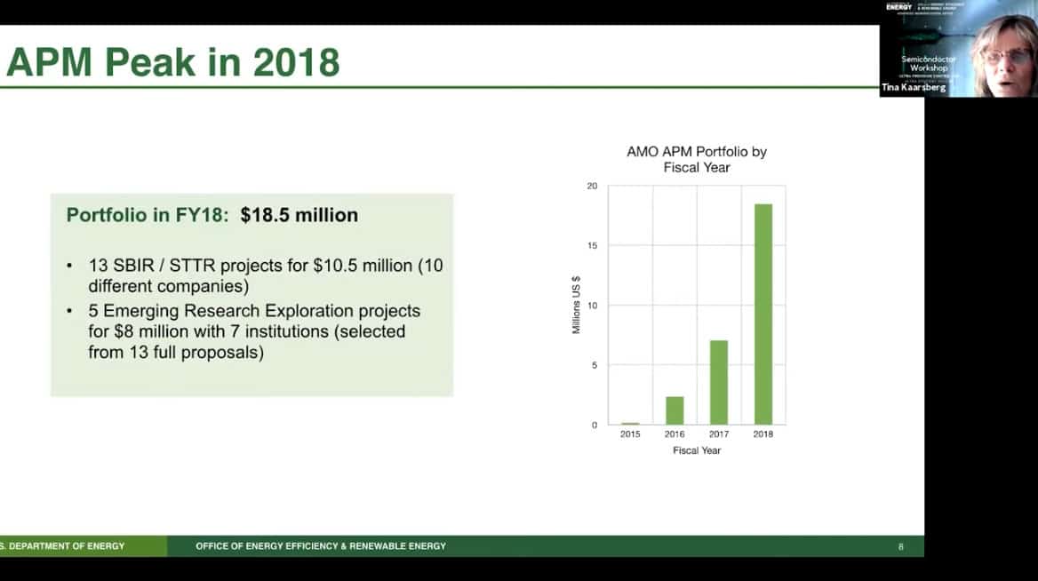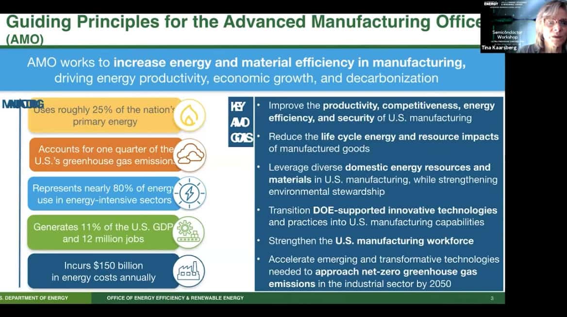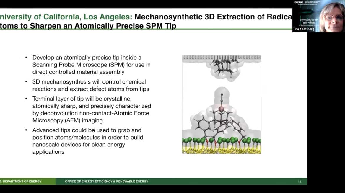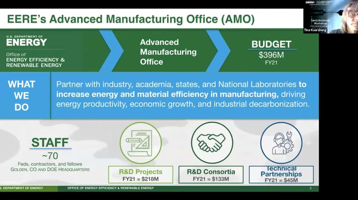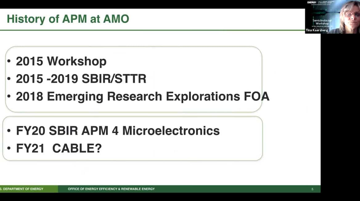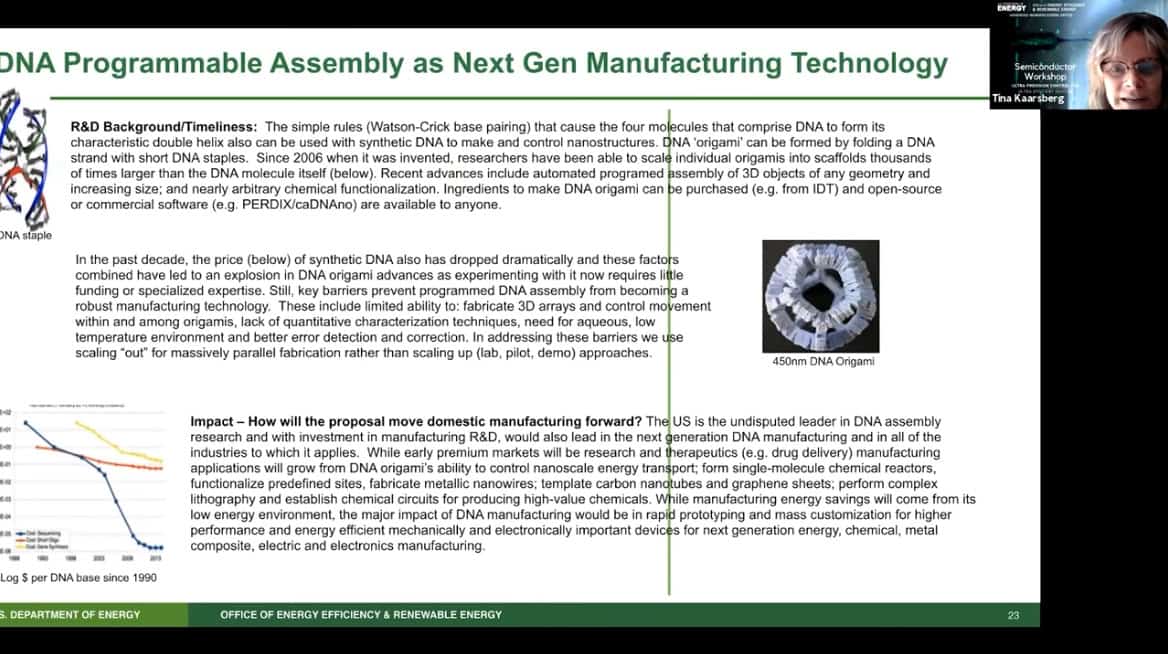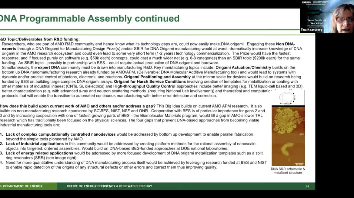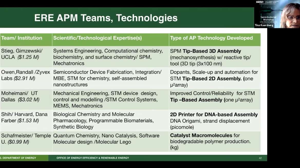 - Presenting today is Tina Kaarsberg of the US Department of Energy, Office of Energy Efficiency and Renewable Energy. She is part of the Advanced Manufacturing Office (AMO) and speaks about Atomically Precise Manufacturing.