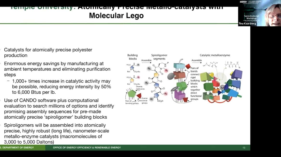- Temple University has been designing and synthesizing atomically precise structures using unique molecular building blocks – molecular lego – to create energy efficient catalysts for polyester production. It could also increase the recyclability of polyester to reduce the environmental hazard from plastic buildup. Of the group, this is probably the most advanced manufacturing technology.