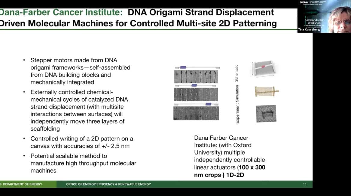 - My management has the hardest time understanding why this project should be part of AMO. I think this is exciting as a next gen manufacturing technology – because its using quaternary logic of DNA binding instead of binary. Stay tuned for my DNA origami PI William Shih to talk next month. I’m trying to figure out how an AMO effort in this area can support the 6 core goals. The US has an undisputed lead in biotech and it would be great to utilize that expertise to help with atomically precise manufacturing and energy efficiency.