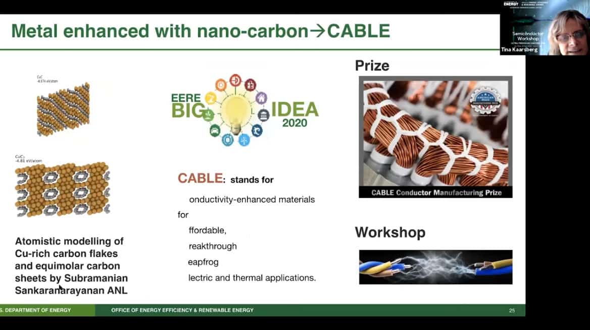 - Metal nanocarbon may be the project where AMO can really show its leadership on atomically precise manufacturing. CABLE stands for Conductivity-enhanced materials for Affordable Breakthrough Leapfrog Electric and thermal applications. This project involves assembling copper and carbon into specific patterns to create better power cables. It became apparent that we should also investigate metal enhanced without nanocarbon, either through rare earths or processing. There’s also the possibility of enhancing nonmetals with metal particles, such as using silver nanoparticles in a polymer.