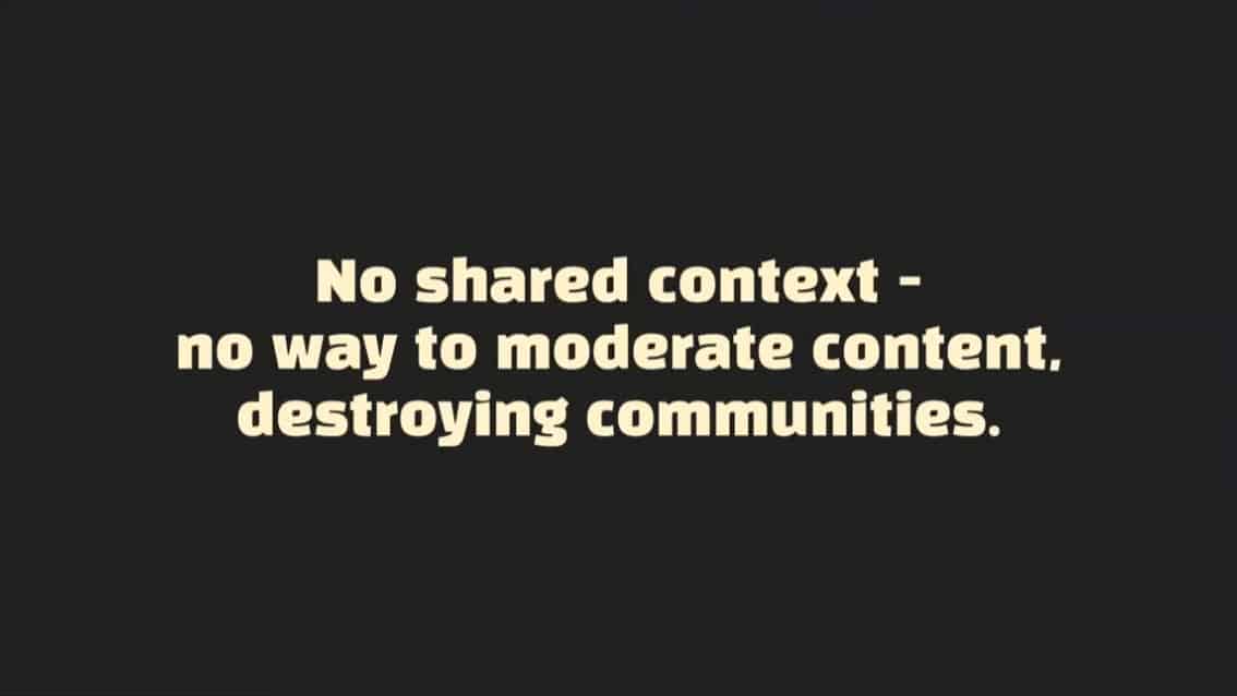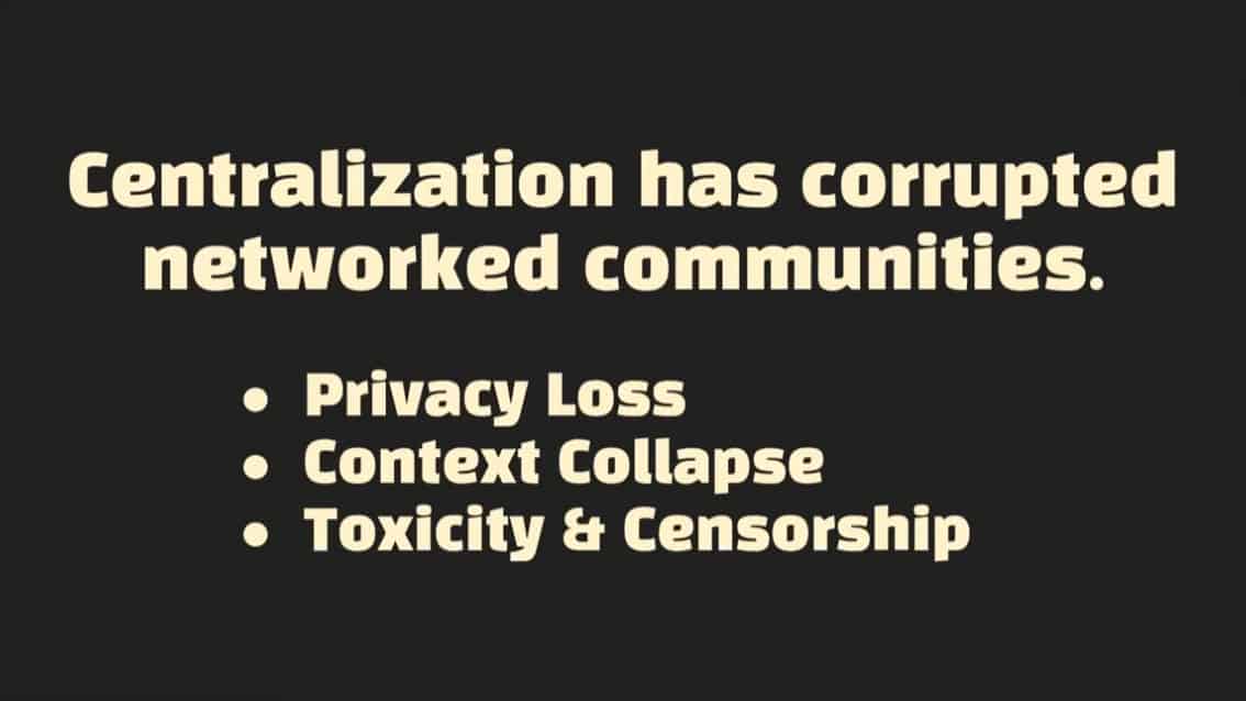 - Centralization has caused privacy loss, context collapse, and toxicity