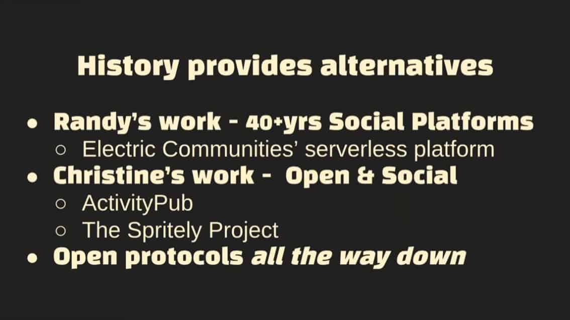 Christine and Randy describe how the current schema of social media has failed us.Ā Networked communities have become centralized around a few large entities which are prone to failure.Ā Poor incentives drive toxic behavior and more regulation will only reinforce the dominance of the current paradigm.Ā The Spritely Institute outlines their plan for a new mechanism of interaction and community formation on the internet.Ā