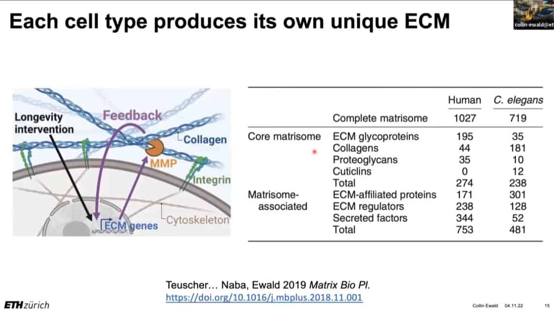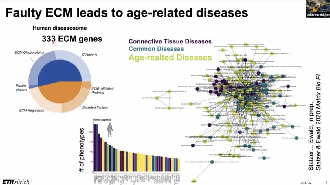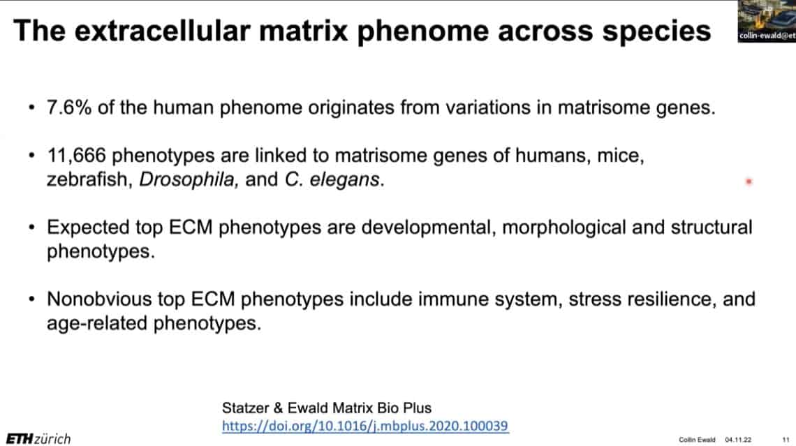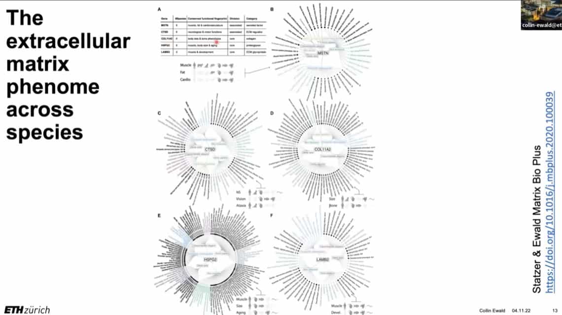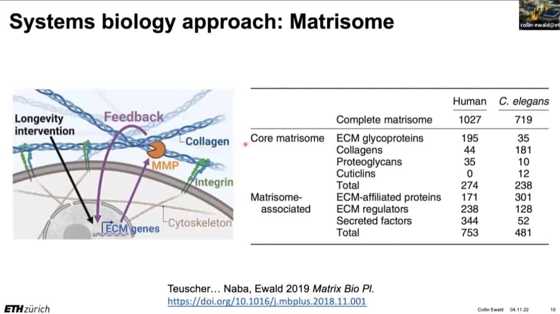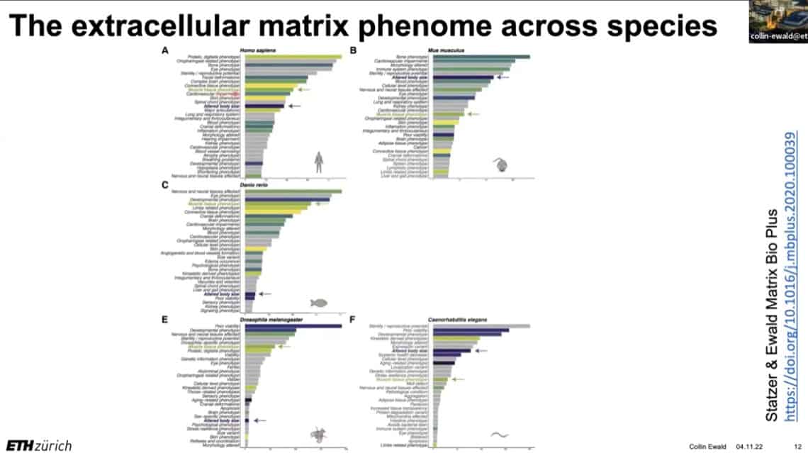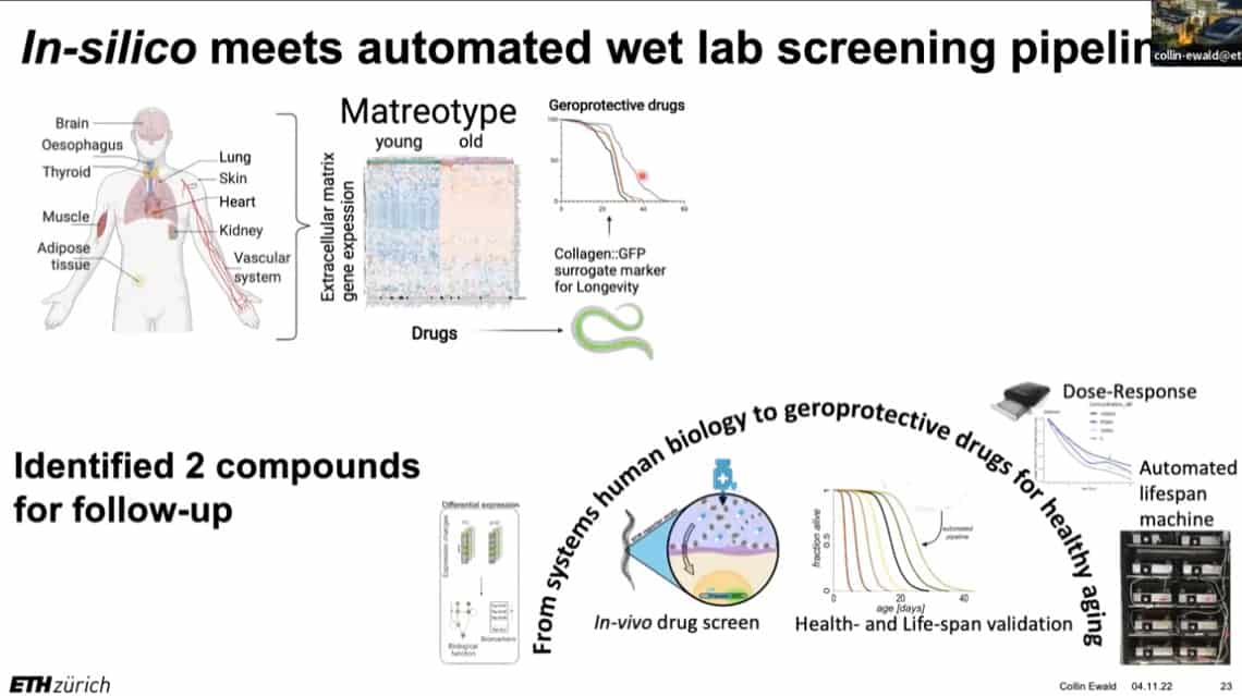 The innate importance of ECM health does not seem to translate to the clinic – there is a therapeutic gap between the impact of ECM on age related disease and the number of clinical trials being carried out on ECM biology. This is partially due to the complexity of human clinical trials. Fortunately, the ECM in model organisms such as mice, worms, and flies can be studied to gain useful insights into how to regenerate and repair extracellular structures in humans. Collin is using gene expression analysis to predict the existence of drugs that affect the ECM in worms and humans, and already has several leading candidates.