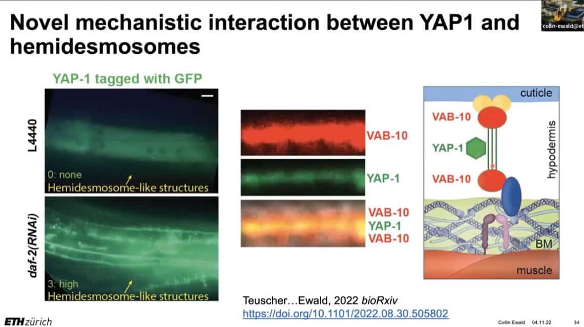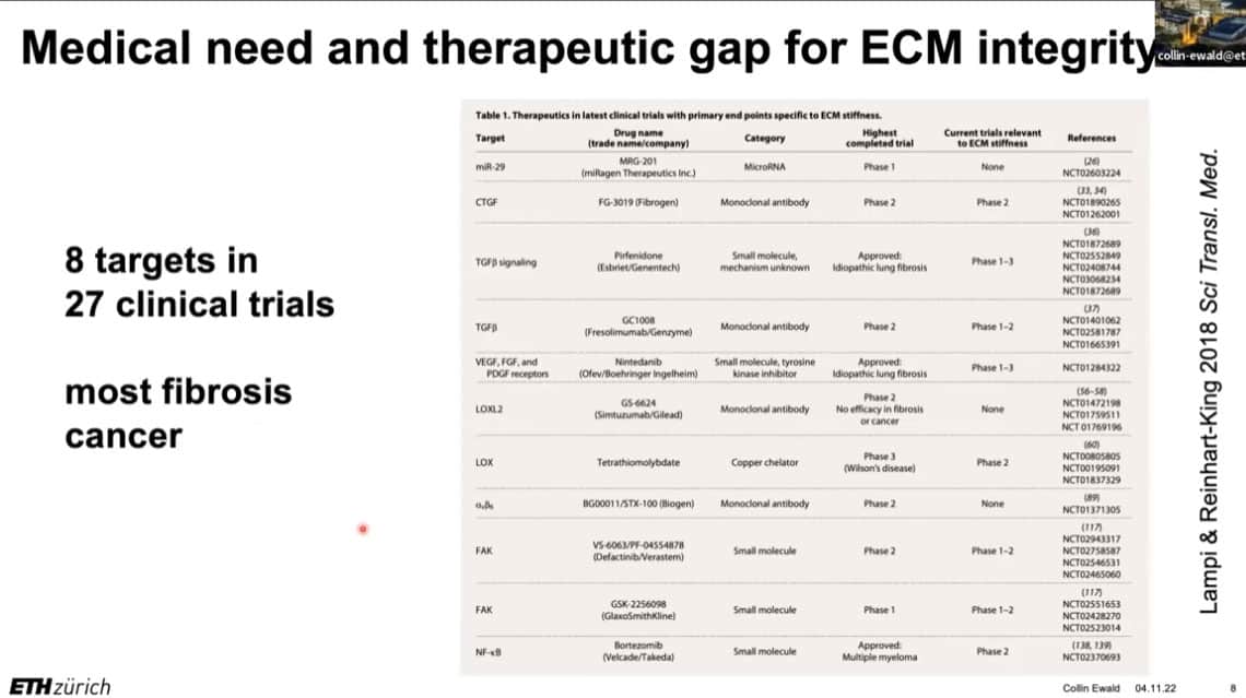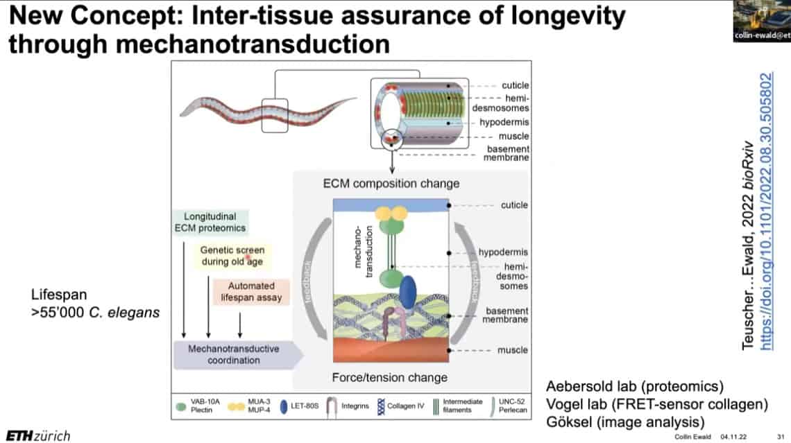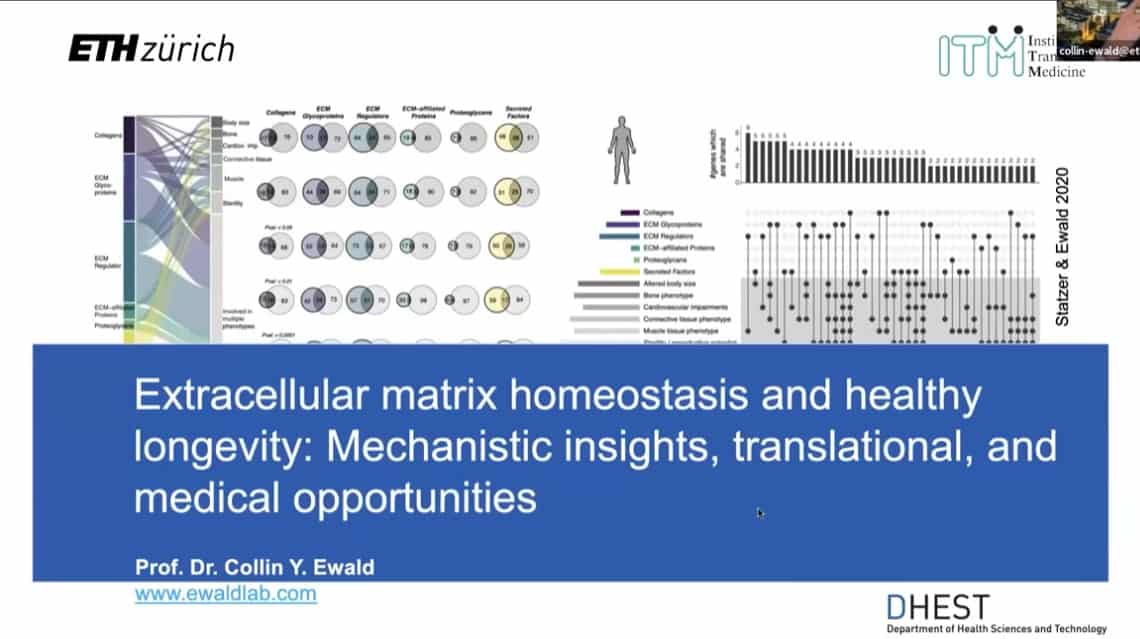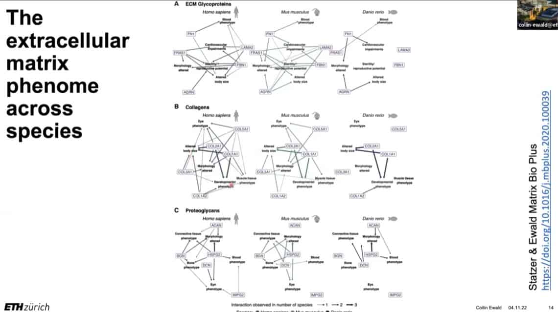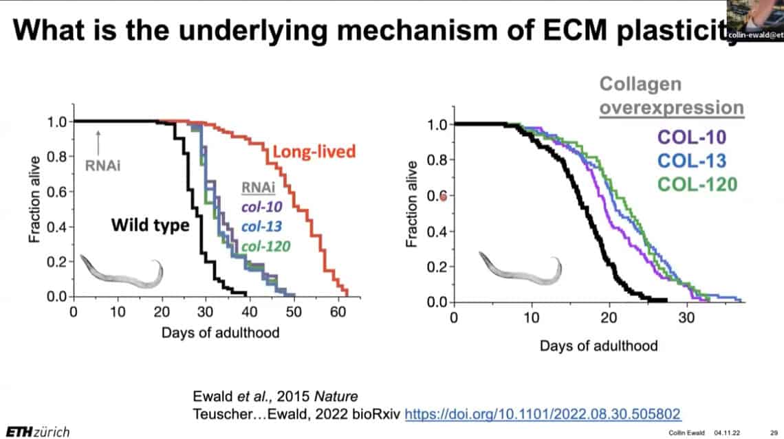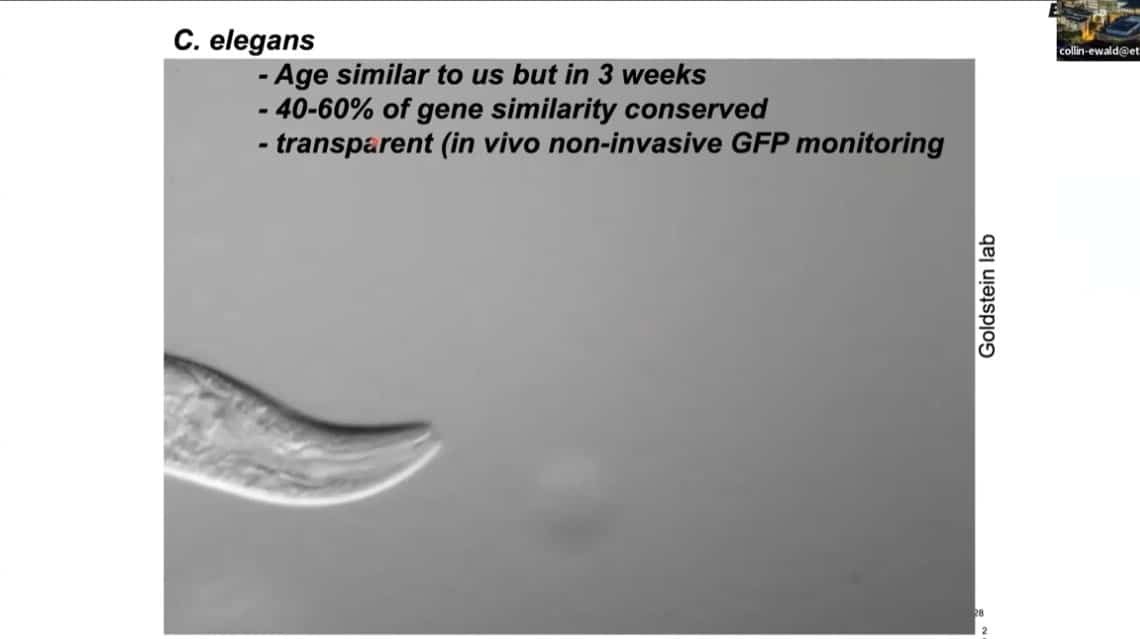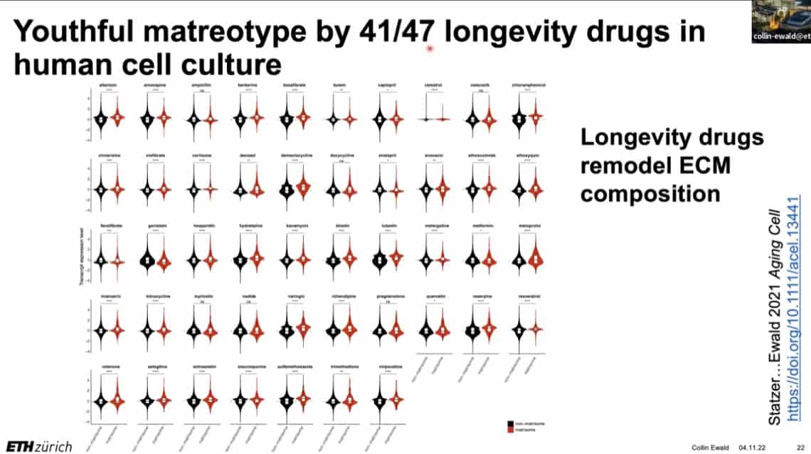 The innate importance of ECM health does not seem to translate to the clinic – there is a therapeutic gap between the impact of ECM on age related disease and the number of clinical trials being carried out on ECM biology. This is partially due to the complexity of human clinical trials. Fortunately, the ECM in model organisms such as mice, worms, and flies can be studied to gain useful insights into how to regenerate and repair extracellular structures in humans. Collin is using gene expression analysis to predict the existence of drugs that affect the ECM in worms and humans, and already has several leading candidates.