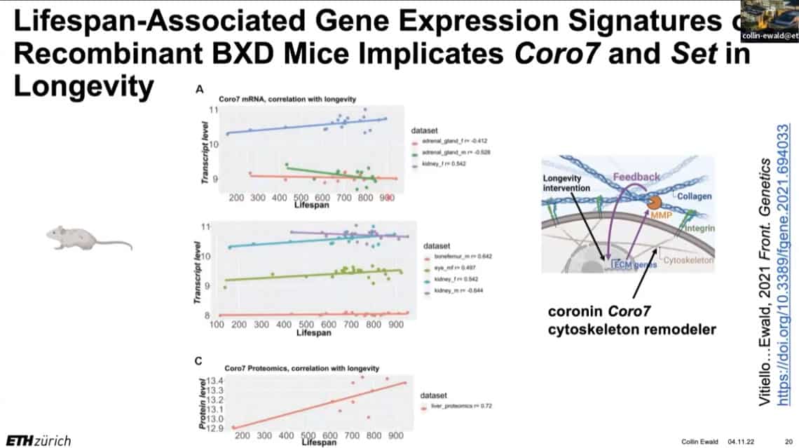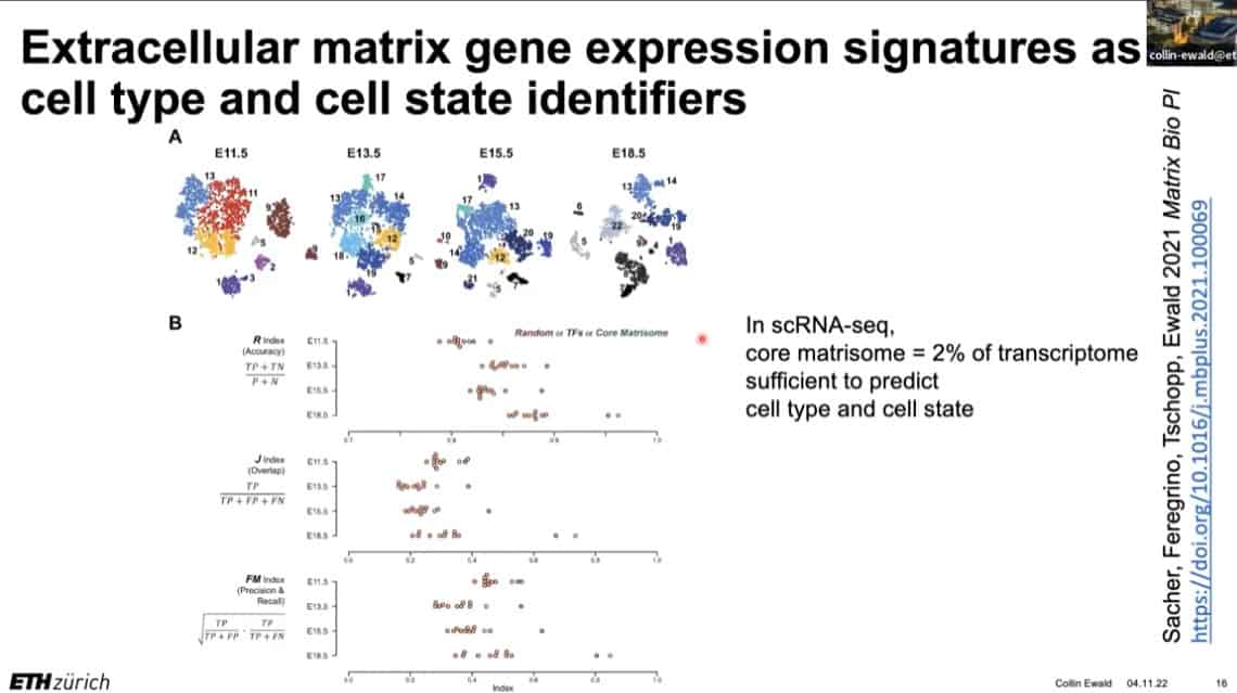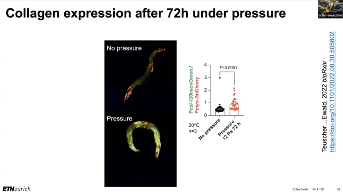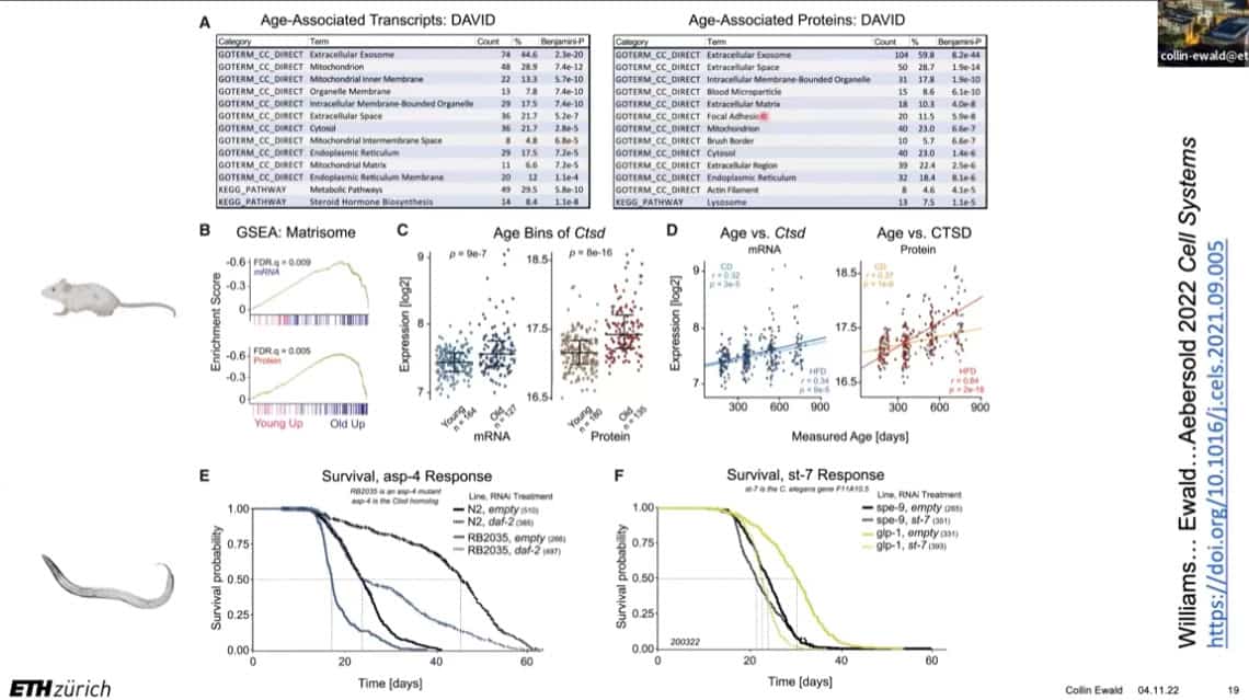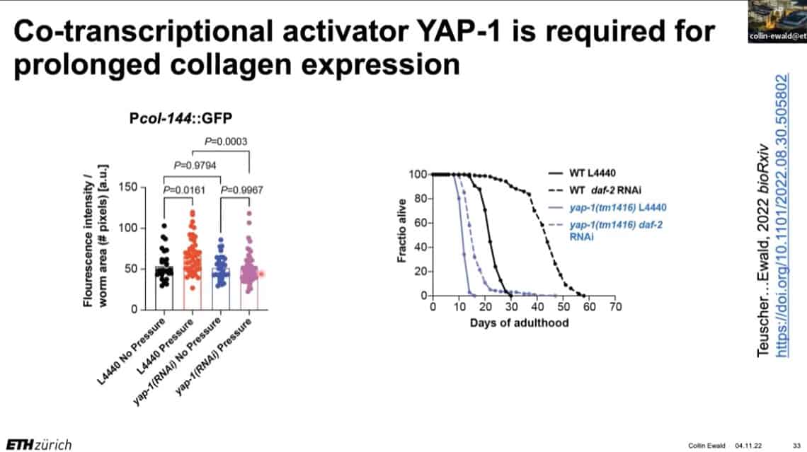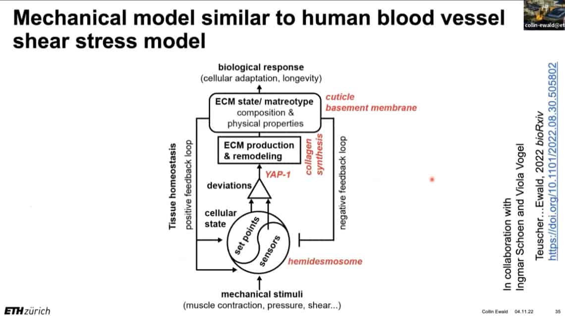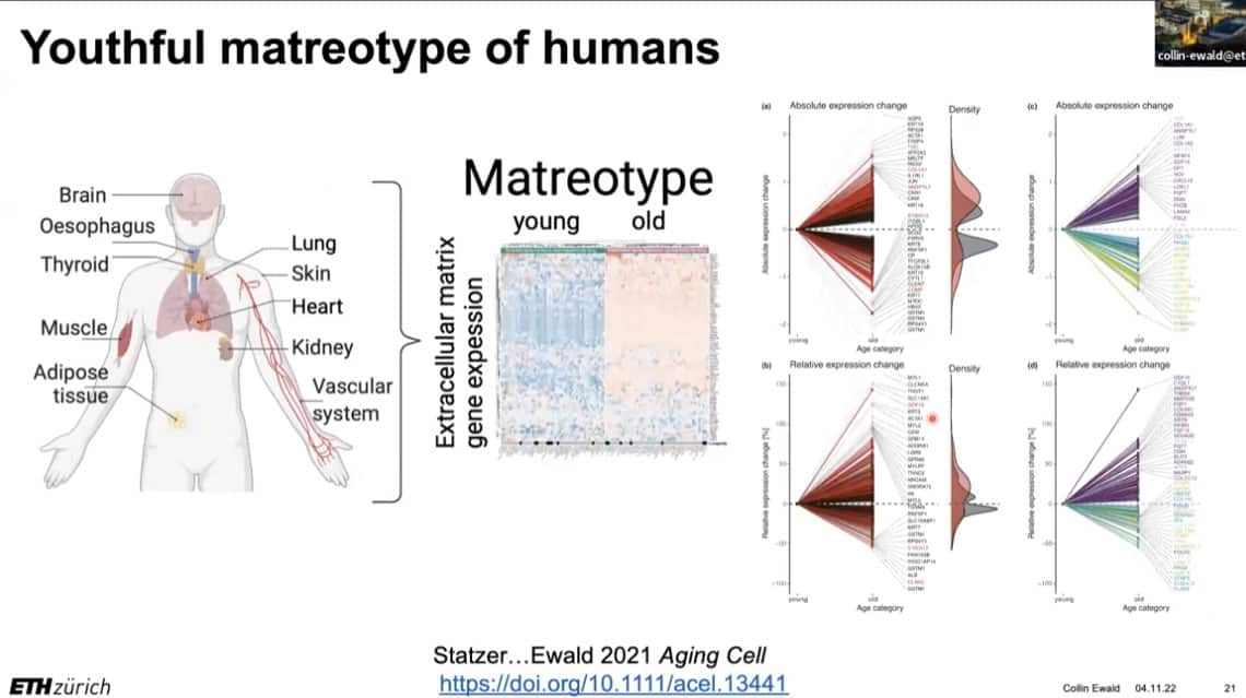 The innate importance of ECM health does not seem to translate to the clinic – there is a therapeutic gap between the impact of ECM on age related disease and the number of clinical trials being carried out on ECM biology. This is partially due to the complexity of human clinical trials. Fortunately, the ECM in model organisms such as mice, worms, and flies can be studied to gain useful insights into how to regenerate and repair extracellular structures in humans. Collin is using gene expression analysis to predict the existence of drugs that affect the ECM in worms and humans, and already has several leading candidates.