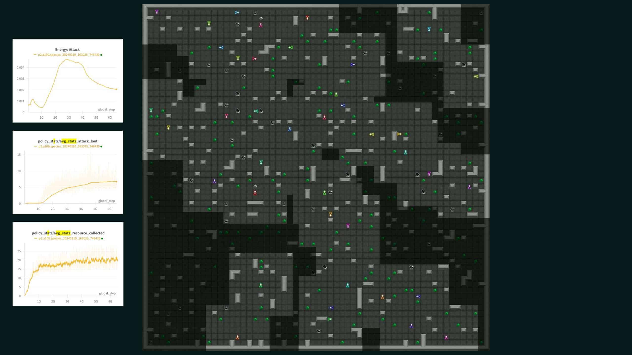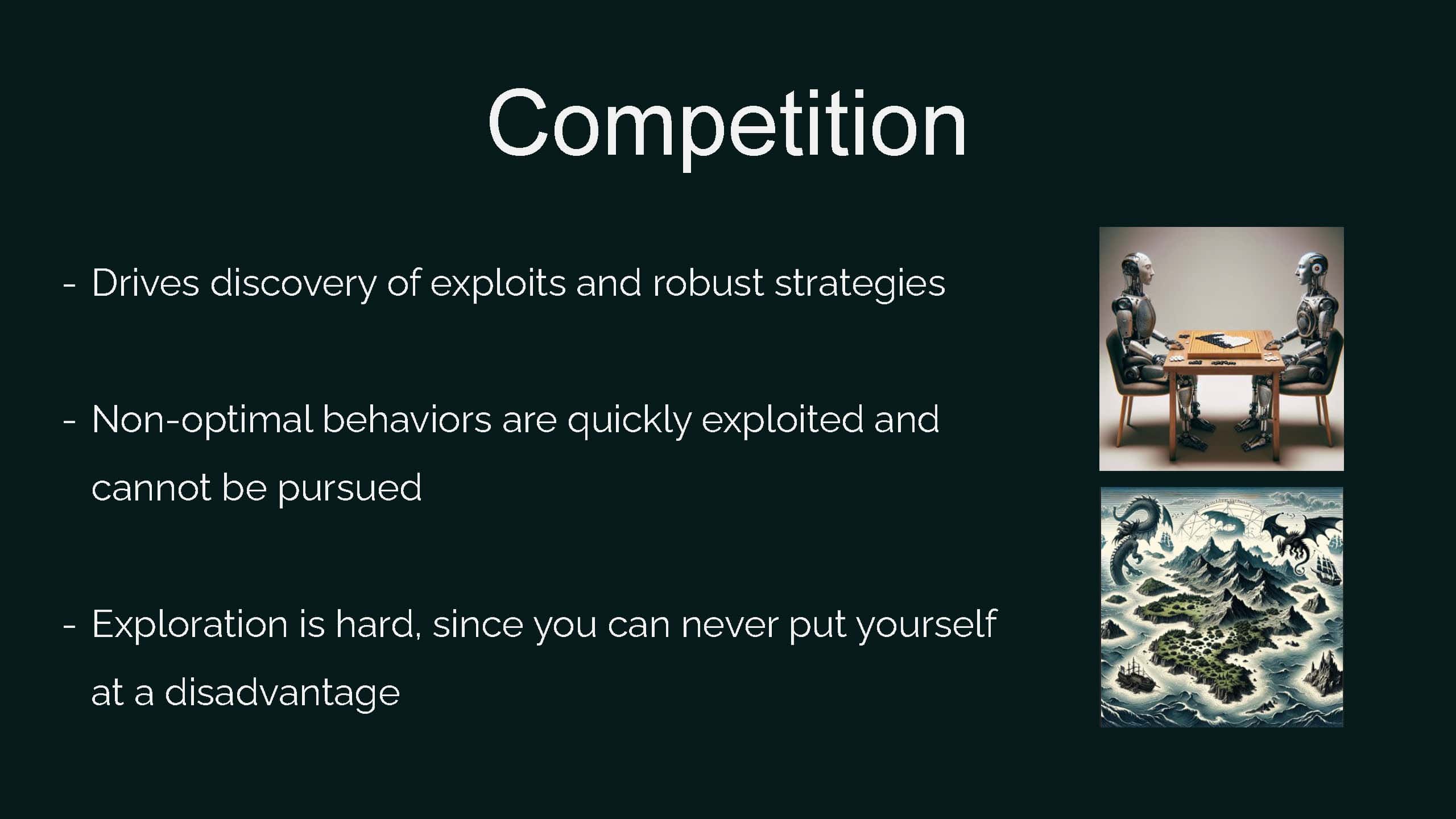 This setup encourages a diverse range of strategies, fostering continuous learning and adaptation. It explores the full spectrum between cooperation and competition, avoiding the pitfalls of stagnant overly adversarial behaviors.