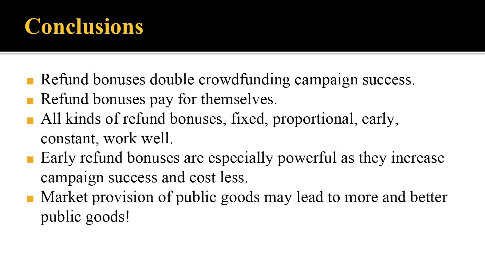 - Refund bonuses paid only to early contributors was the most successful scheme: more early successes and more total successes than any other method.