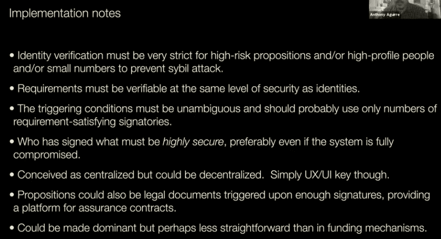 - Alex: Local public goods make a lot of sense to me: improving your neighborhood. And of course, smart contract based funding systems for blockchain protocols changes could certainly be a use case.