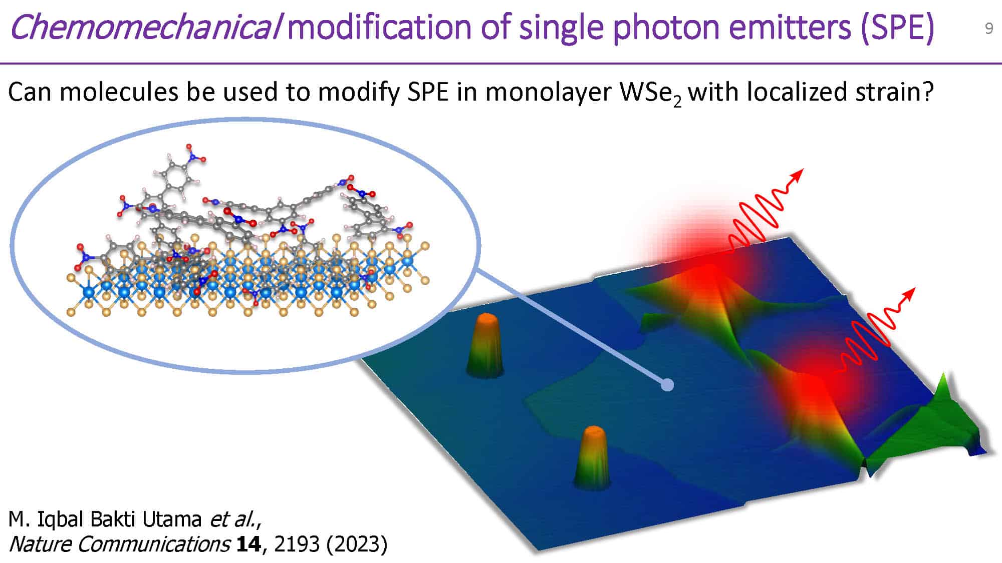Quantum information science has the potential to transform computing, communication, and sensing. Among quantum architectures, photonic systems have the advantage of producing mobile qubits for high-speed information transmission. Single photons play a critical role in this context, and significant attention has been dedicated to developing solid-state materials with robust single-photon emission properties. Two-dimensional (2D) materials have attracted attention for quantum information science due to their ability to host single-photon emitters (SPEs). Although the properties of atomically thin materials are highly sensitive to surface modification, chemical functionalization remains unexplored in the design and control of 2D material SPEs. Here, we report a chemomechanical approach to modify SPEs in monolayer WSe2 through the synergistic combination of localized mechanical strain and noncovalent surface functionalization with aryl diazonium chemistry. By revealing conditions under which chemical functionalization tunes SPEs, this work broadens the parameter space for controlling quantum emission in 2D materials.Â