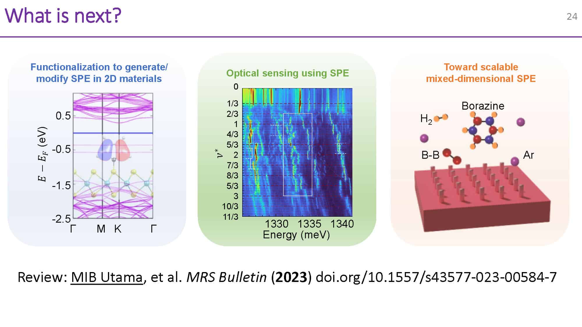 Several key parameters on 2D materials need to be improved for them to work as optically active qubits in practical applications, including extraction efficiency, excited-state lifetime, coherence time, quantum efficiency, stability, and emission wavelength control.