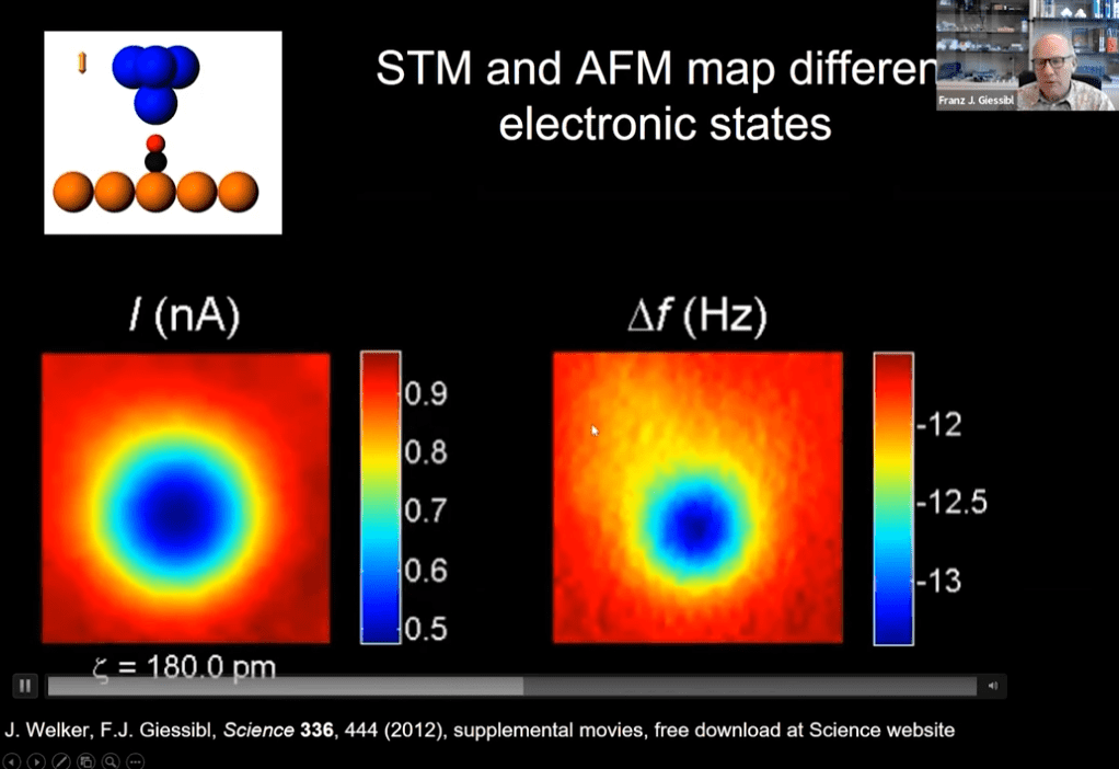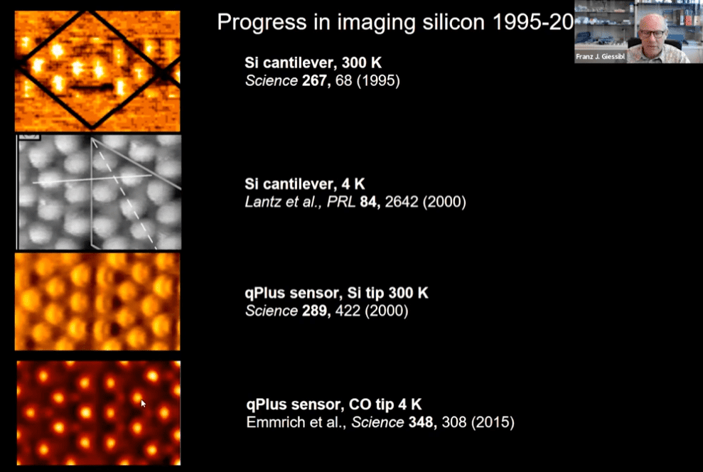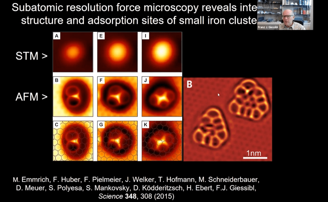 - Giessibl goes on to discuss imaging of single atoms of copper, iron, and silicon using both atomic force and scanning tunneling microscopy, and the resolution limitations of each.