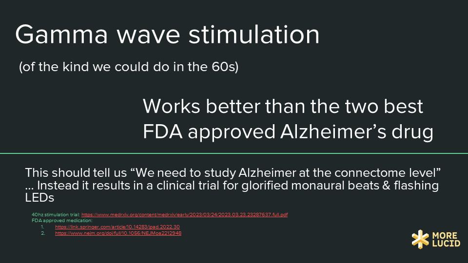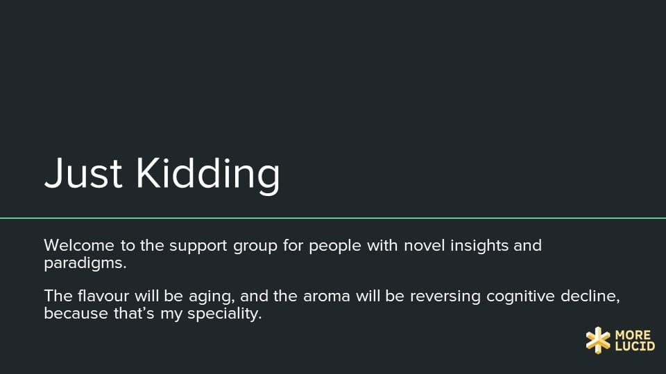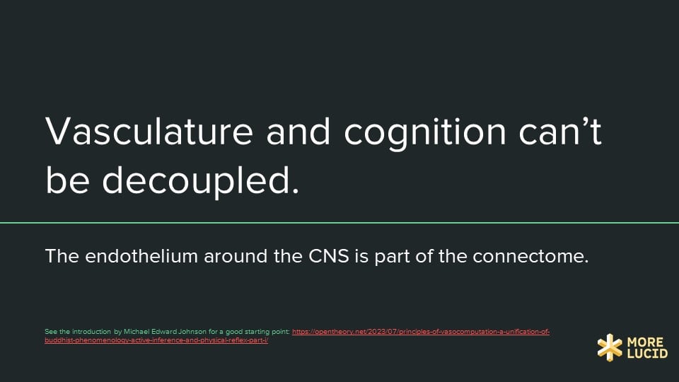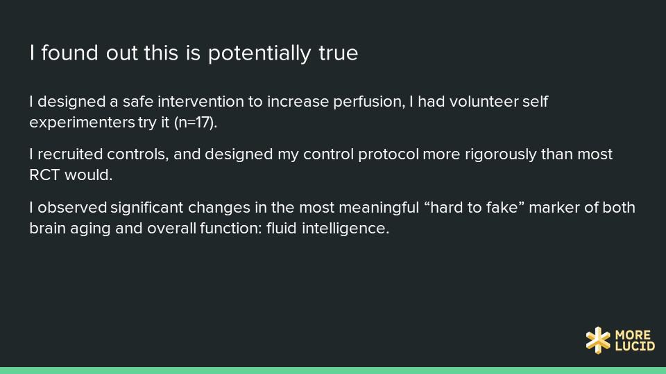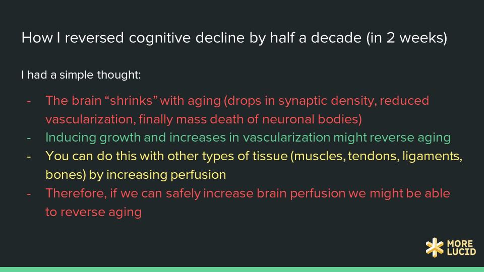 I will briefly cover my own experiments and what they revealed about “low-hanging fruit” in the realm of solving cognitive decline, as well as the blockers that I faced trying to work outside of a molecular biology paradigm (or a medical paradigm) and instead look at a new layer: vasculature as the system of control.