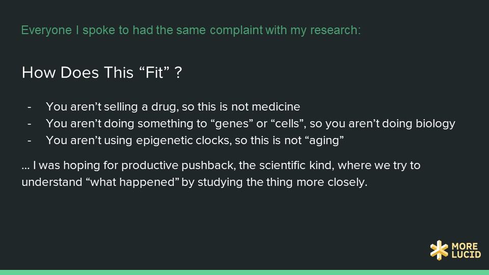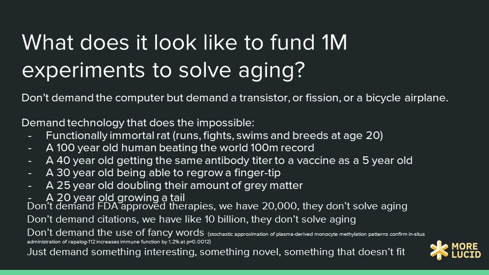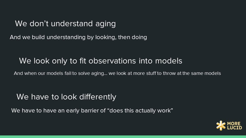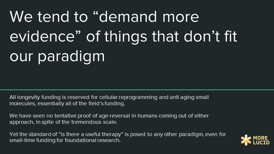 Tying everything up we’ll look at how various interesting outside-of-paradigm findings and facts we often ignore could help us find new experimental directions with the goal of solving human longevity, as well as advancing our understanding and control over biological systems more broadly.