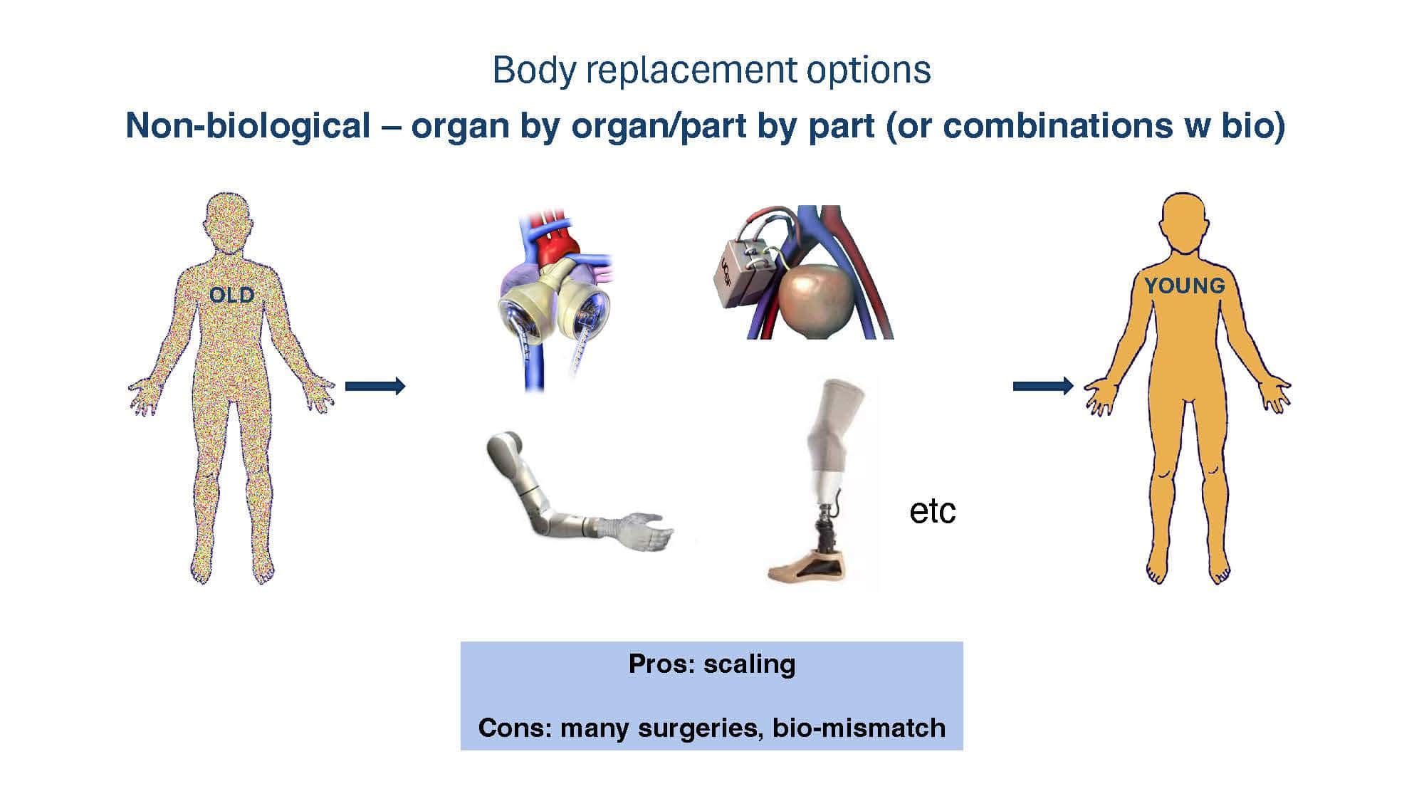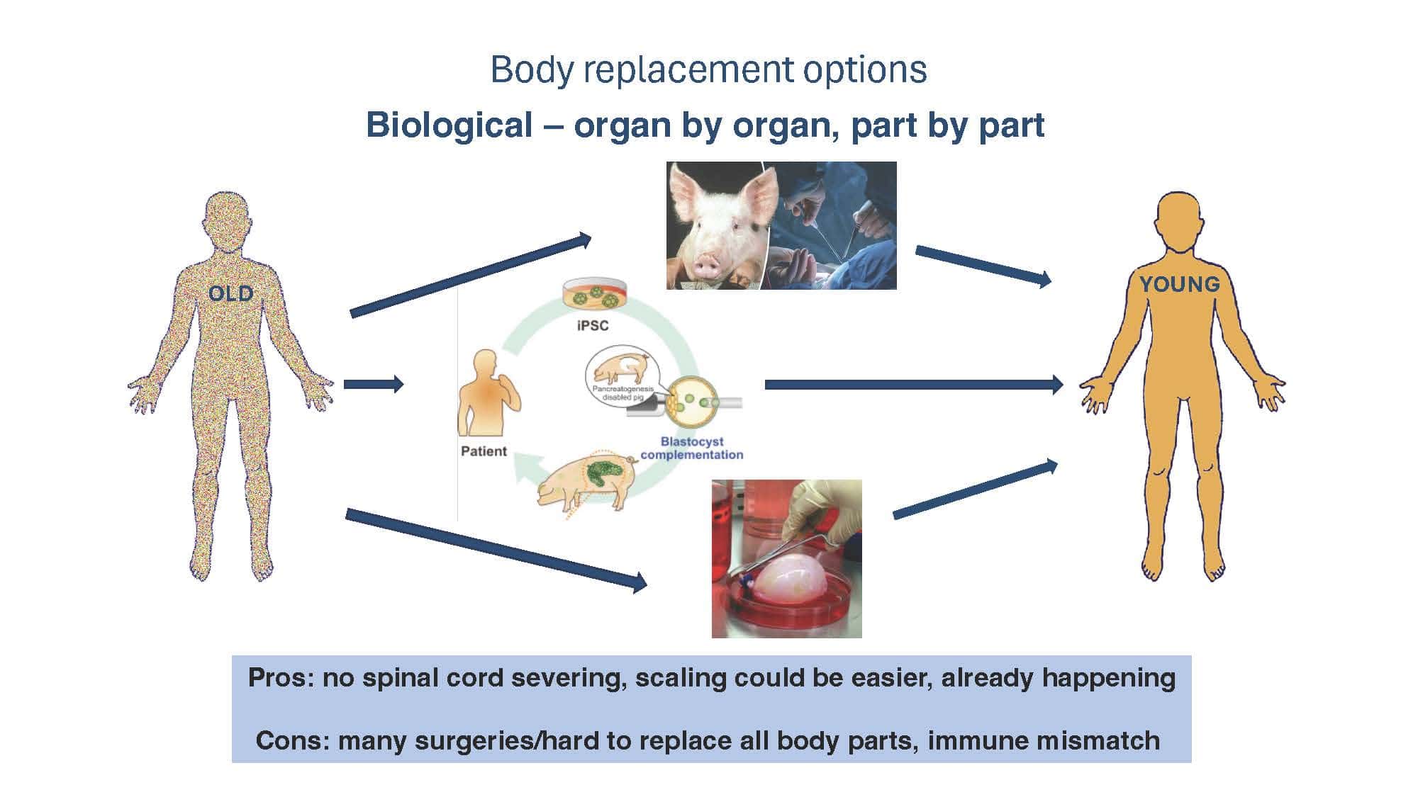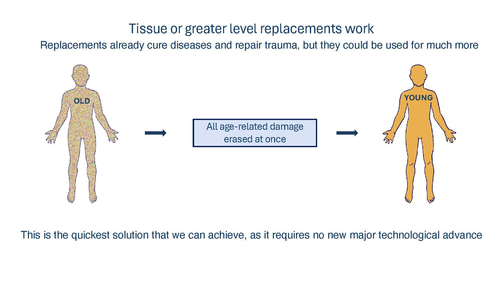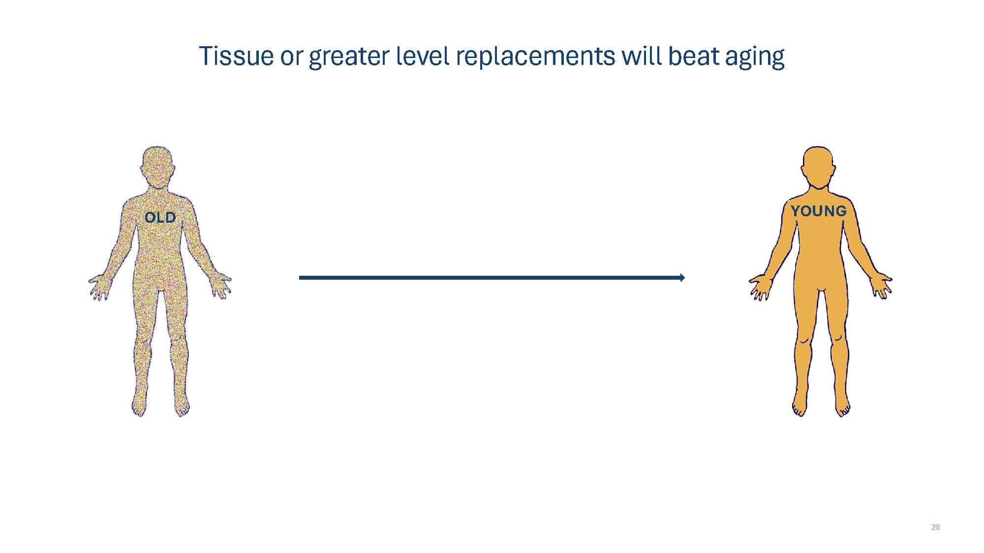 With the goal of spurring discussion, the talk will present arguments for why replacement strategies at the tissue level or greater overcome limitations of non-replacement strategies in beating aging. A broad overview of replacement approaches will then be provided to compare and contrast the pros and cons of each, with a special focus on the brain, which remains our greatest challenge.