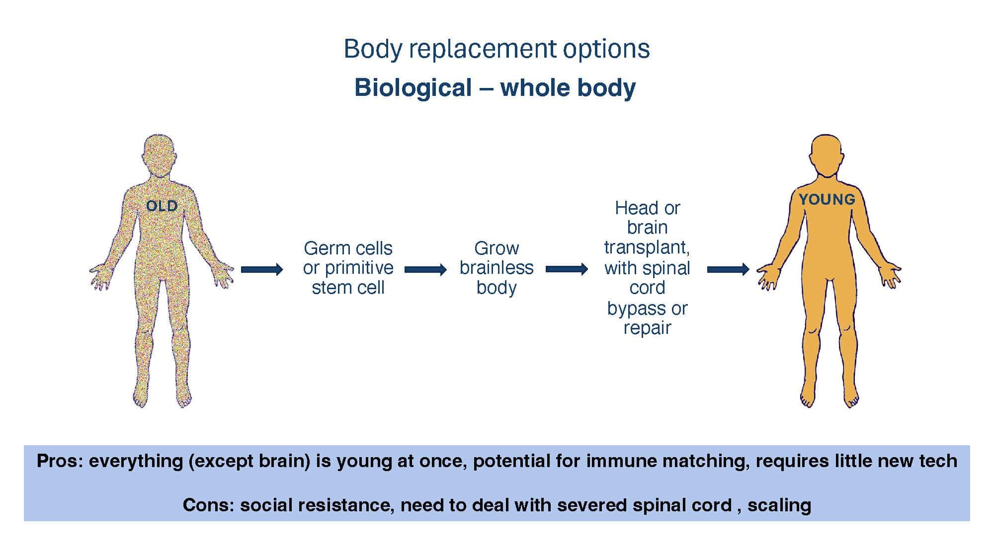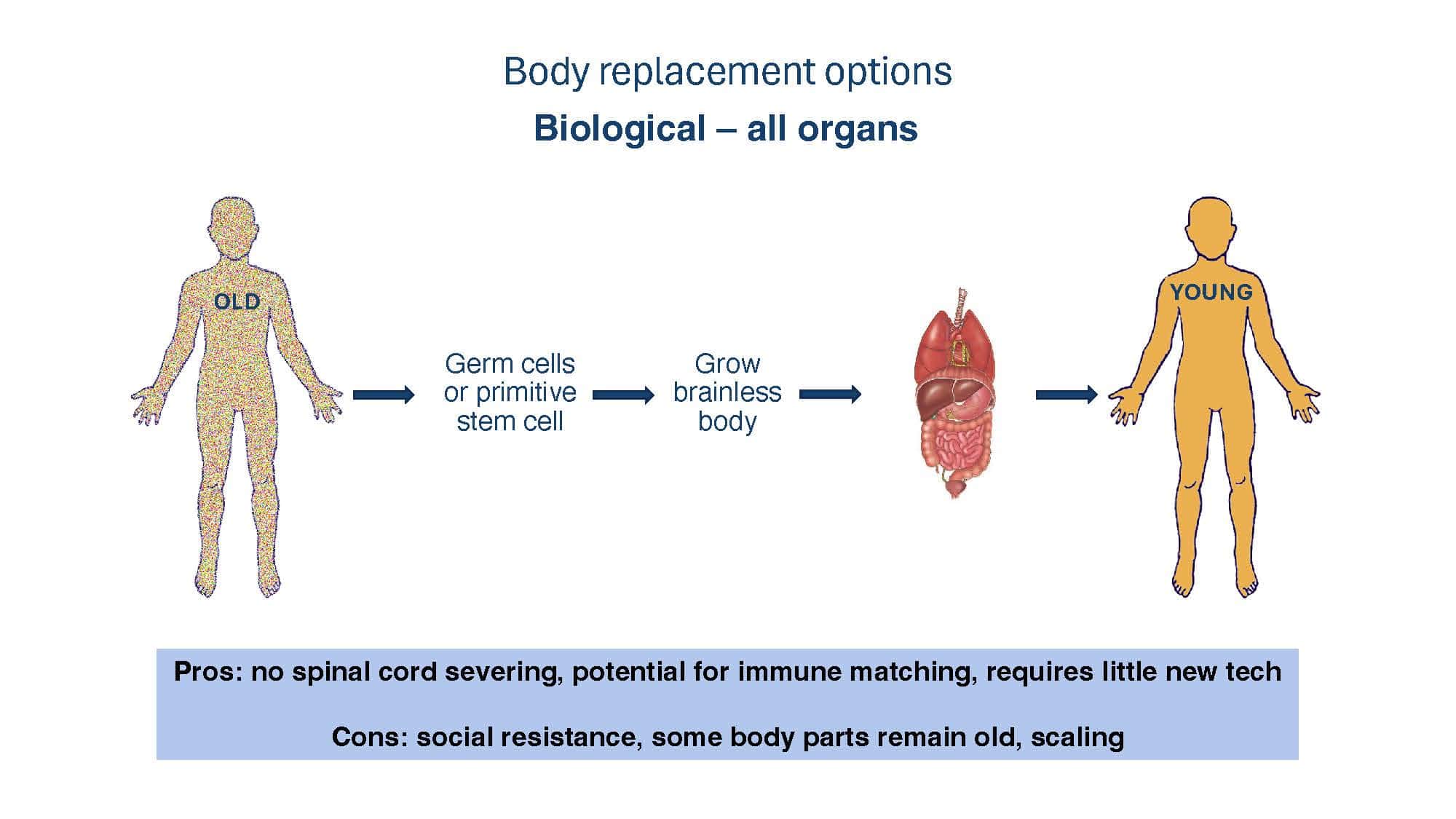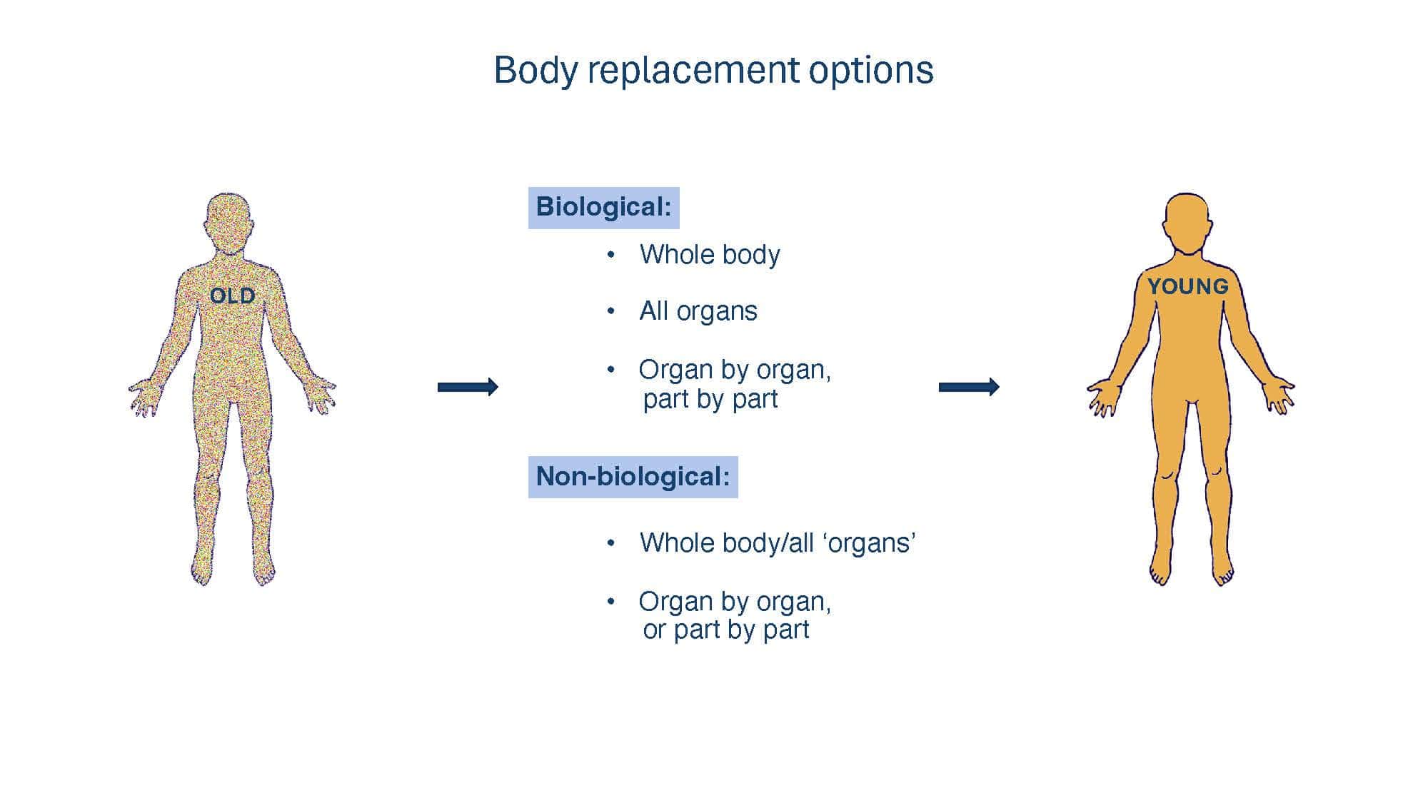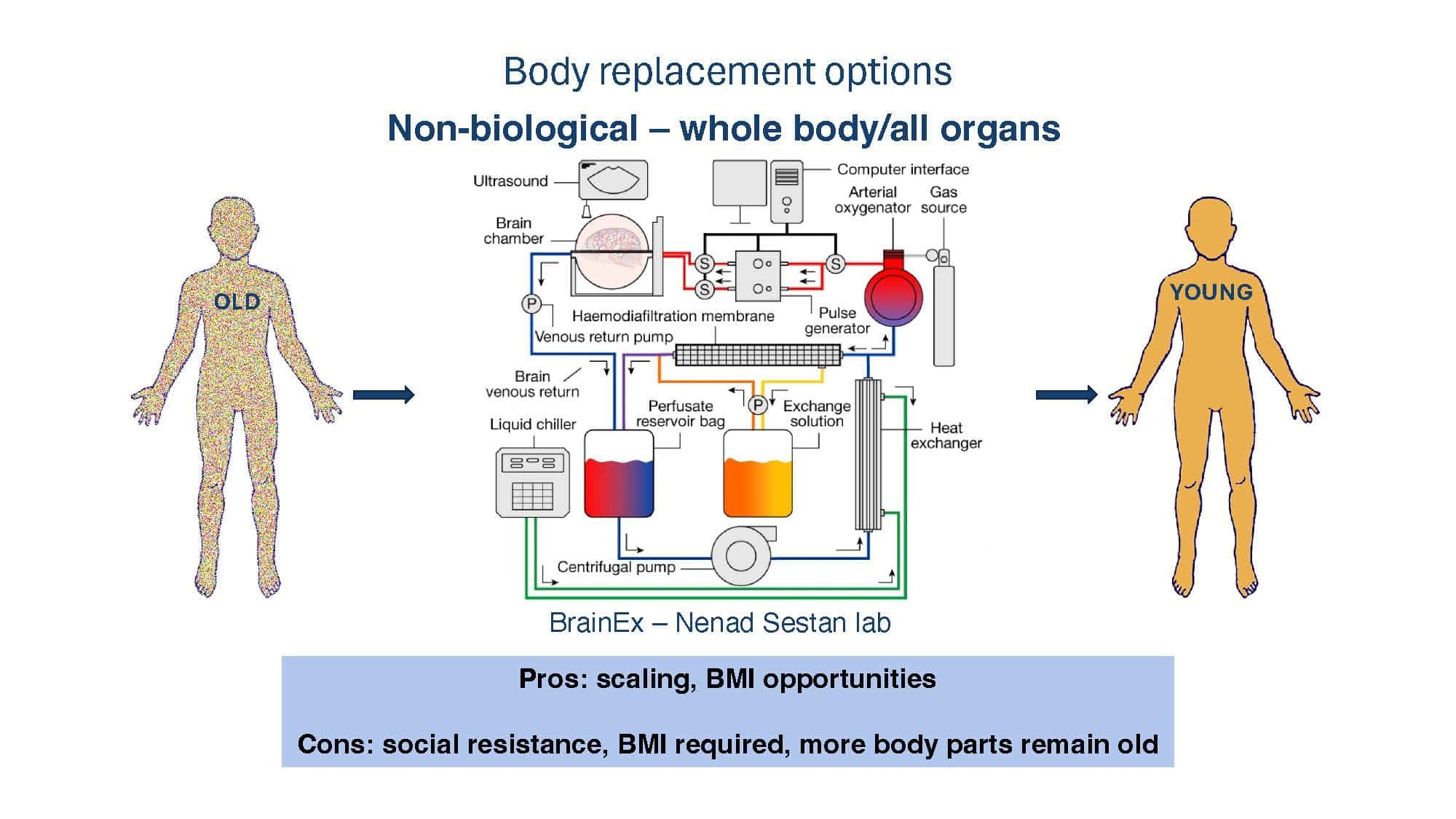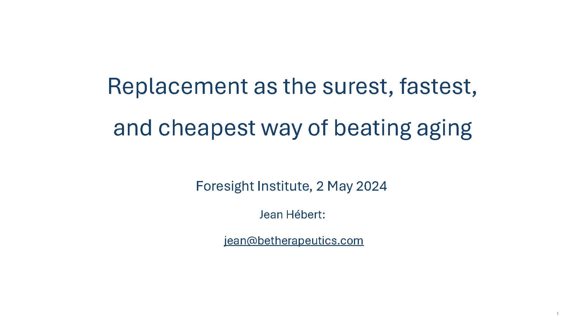 With the goal of spurring discussion, the talk will present arguments for why replacement strategies at the tissue level or greater overcome limitations of non-replacement strategies in beating aging. A broad overview of replacement approaches will then be provided to compare and contrast the pros and cons of each, with a special focus on the brain, which remains our greatest challenge.