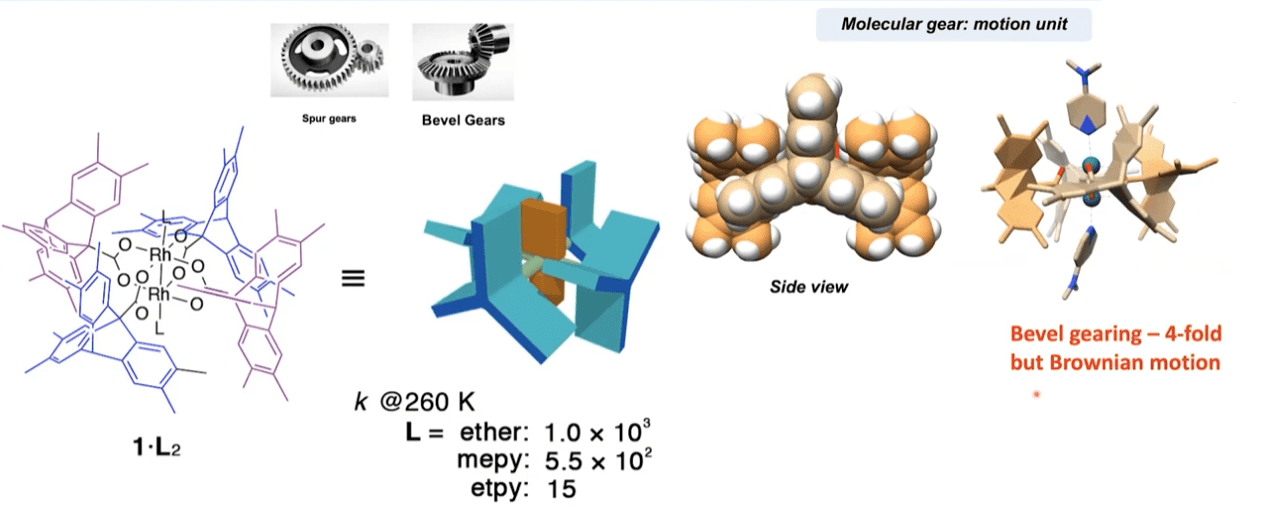 Another version made by shiyonoya et. al. is a 4 rotor gear that operates much like a bevel gear. Various ligands can be used for the attachment points, which alters rotation speed as measured by dynamic NMR.