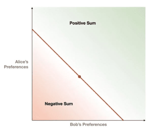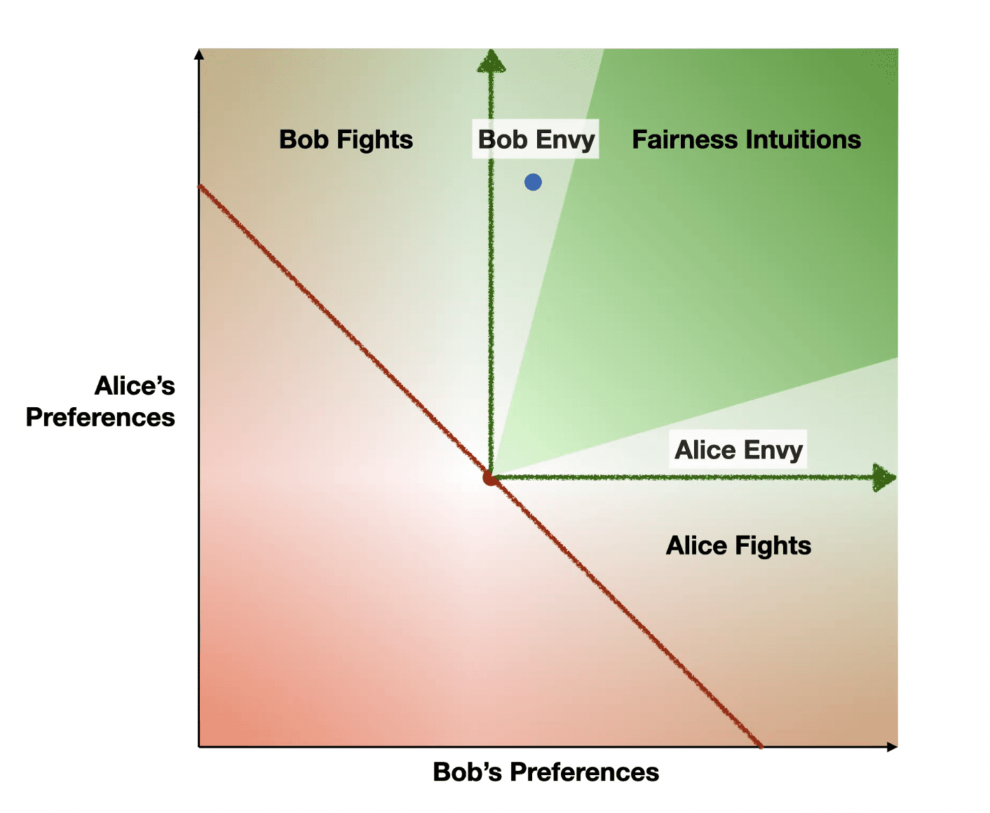 - In the chart, the red dot is the state of the world. Y-values are “utility to Alice” and the x-values are “utility to Bob”. So Alice wants the dot to move up, and Bob wants it to move right.