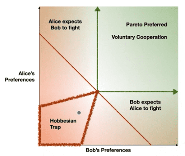 - Nash Equilibrium Trap: individual players can’t make incrementally make moves towards the world we all prefer, because there are intermediate states where one or more is better off and lose the incentive to cooperate