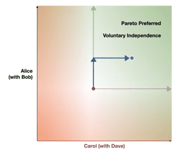 - In the “Pareto Preferred” region, where voluntary cooperation resides, someone is better off and nobody is worse off, so there’s no reason for anyone to not go along with the plan.